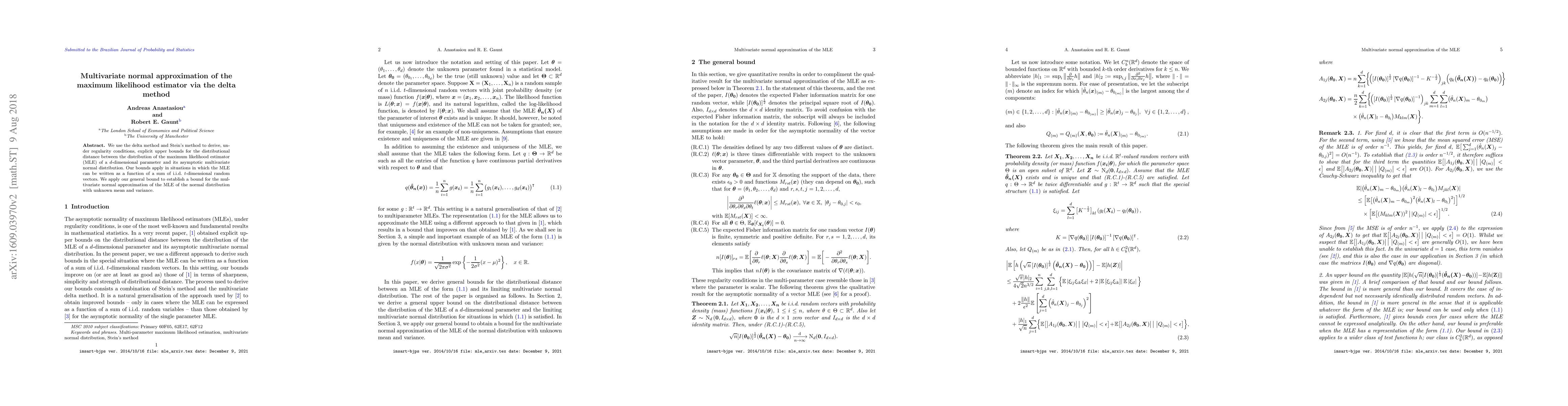 This paper employs the delta method and Stein's method to provide explicit upper bounds for the distributional distance between the maximum likelihood estimator (MLE) and its asymptotic multivariate normal distribution, applicable to MLEs derived from sums of i.i.d. random vectors. It specifically establishes a bound for the MLE of the normal distribution with unknown mean and variance.