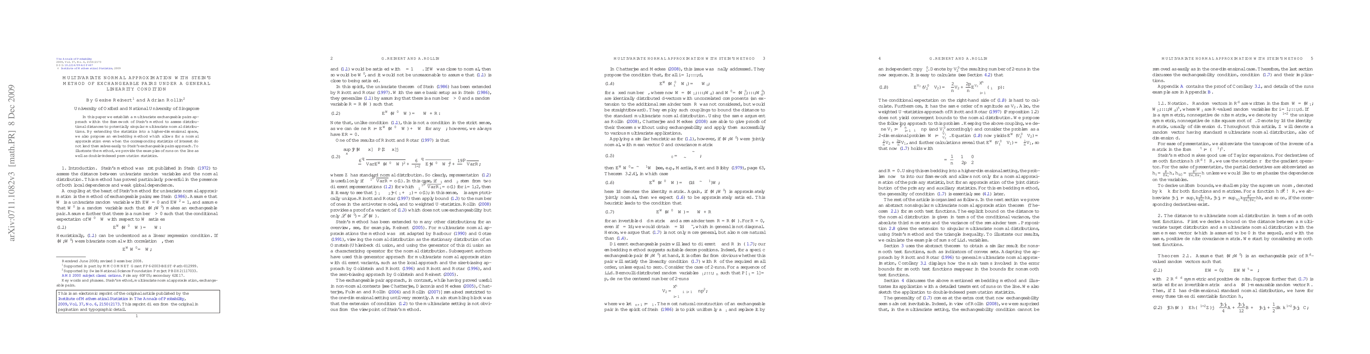 This paper utilizes Stein's method of exchangeable pairs to approximate the distribution of multivariate statistics to singular normal distributions, proposing an embedding technique for complex statistics. Examples include runs on the line and double-indexed permutation statistics.