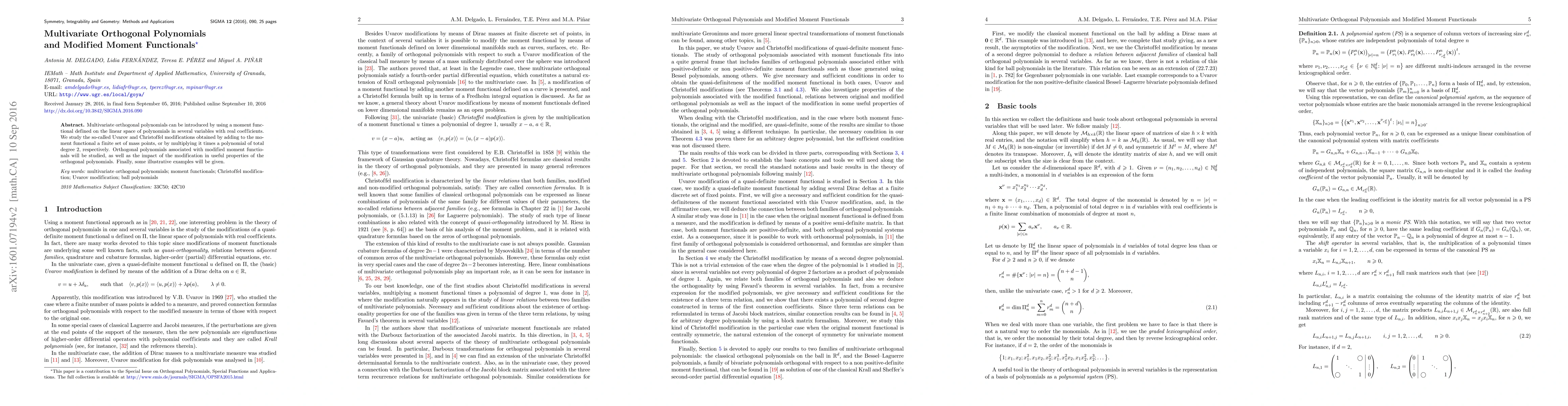 This paper investigates multivariate orthogonal polynomials derived from modified moment functionals, specifically focusing on Uvarov and Christoffel modifications. It examines the effects of these modifications on the properties of the associated orthogonal polynomials and provides illustrative examples.