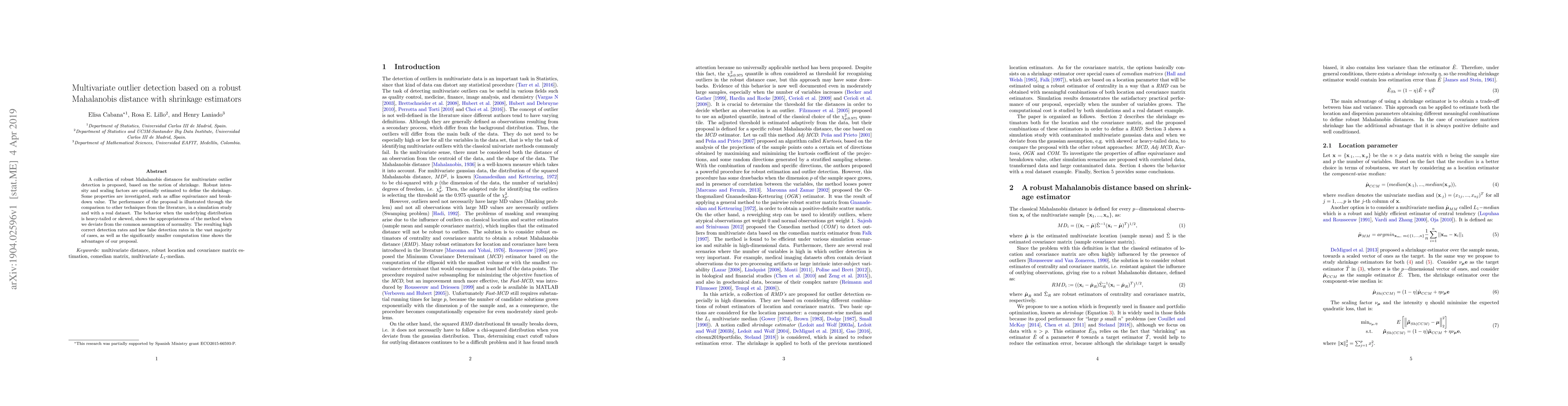 The paper proposes a collection of robust Mahalanobis distances for multivariate outlier detection, using shrinkage estimators for optimal estimation of intensity and scaling factors. Properties like affine equivariance and breakdown value are investigated.
