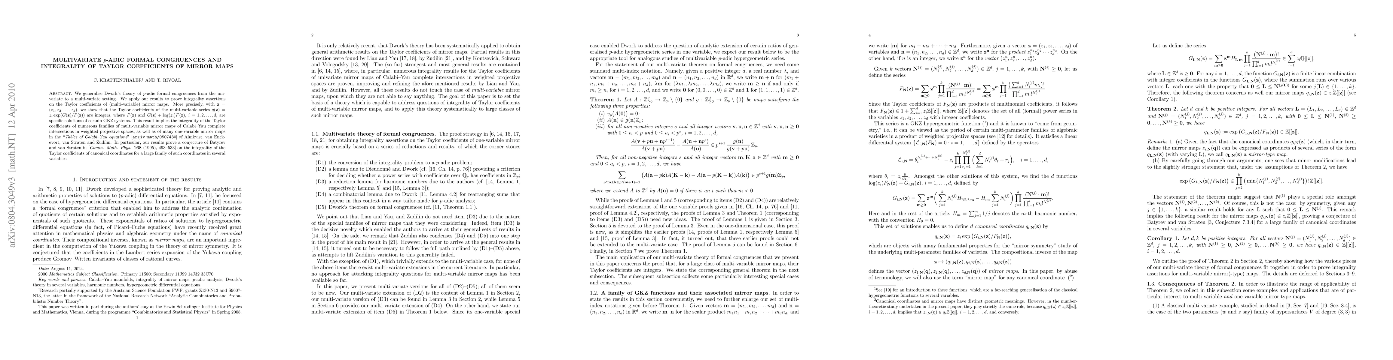 This research generalizes p-adic formal congruences from univariate to multivariate, proving the integrality of Taylor coefficients of multi-variable mirror maps. It confirms a conjecture by Batyrev and van Straten, impacting numerous families of multi-variable Calabi-Yau mirror maps and one-variable mirror maps listed in specific tables.