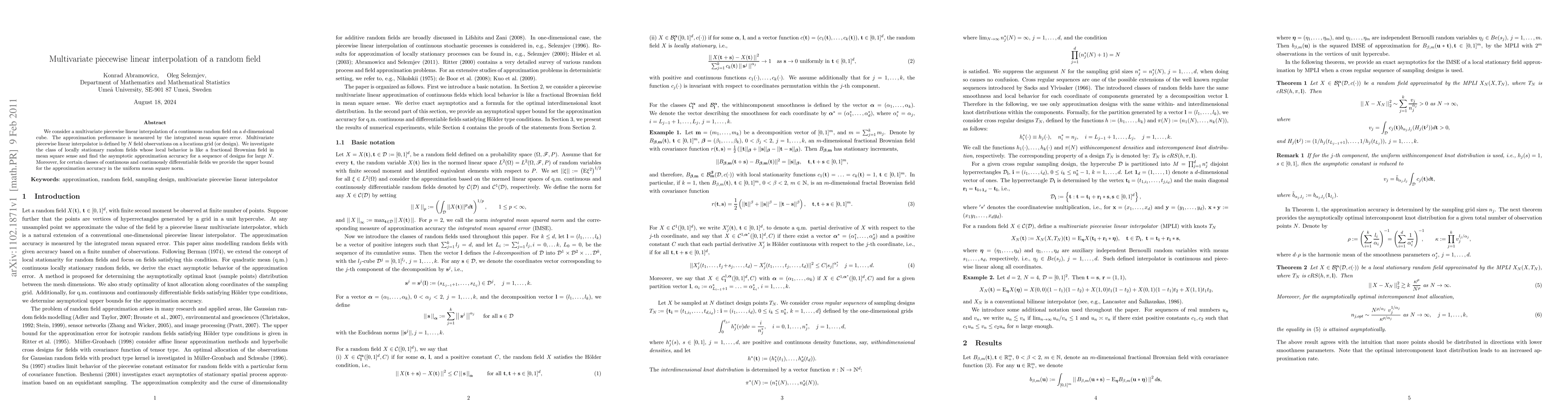 This paper studies multivariate piecewise linear interpolation for continuous random fields on a d-dimensional cube, focusing on approximation performance measured by integrated mean square error. It investigates locally stationary random fields and provides asymptotic accuracy and upper bounds for approximation accuracy for large N.