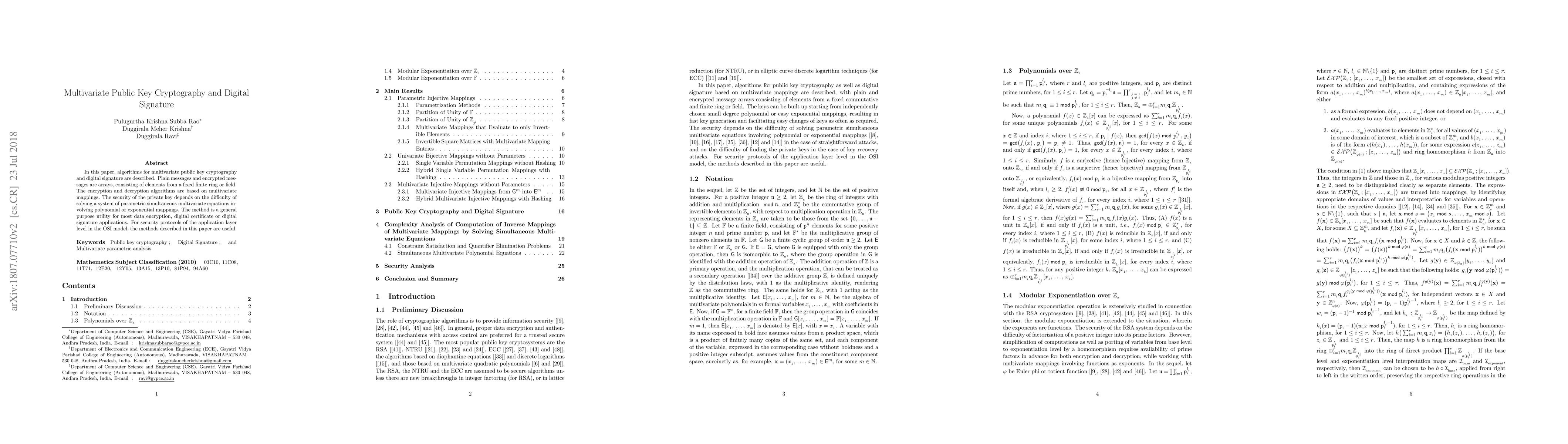 In this paper, algorithms for multivariate public key cryptography and digital signature are described. Plain messages and encrypted messages are arrays, consisting of elements from a fixed finite ring or field. The encryption and decryption algorithms are based on multivariate mappings. The security of the private key depends on the difficulty of solving a system of parametric simultaneous multivariate equations involving polynomial or exponential mappings. The method is a general purpose utility for most data encryption, digital certificate or digital signature applications. For security protocols of the application layer level in the OSI model, the methods described in this paper are useful.