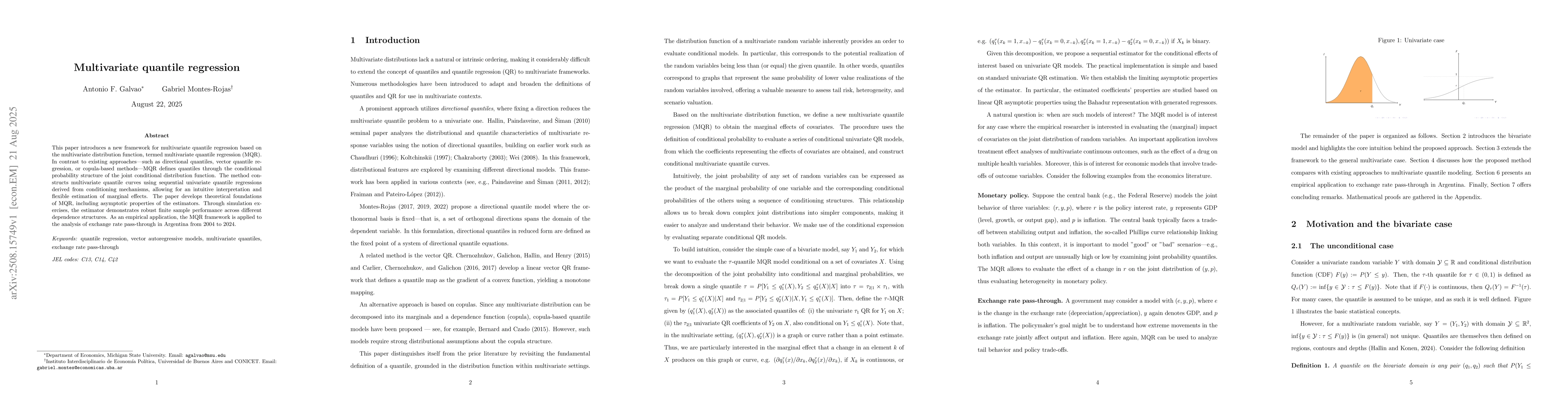 This paper introduces a new framework for multivariate quantile regression based on the multivariate distribution function, termed multivariate quantile regression (MQR). In contrast to existing approaches--such as directional quantiles, vector quantile regression, or copula-based methods--MQR defines quantiles through the conditional probability structure of the joint conditional distribution function. The method constructs multivariate quantile curves using sequential univariate quantile regressions derived from conditioning mechanisms, allowing for an intuitive interpretation and flexible estimation of marginal effects. The paper develops theoretical foundations of MQR, including asymptotic properties of the estimators. Through simulation exercises, the estimator demonstrates robust finite sample performance across different dependence structures. As an empirical application, the MQR framework is applied to the analysis of exchange rate pass-through in Argentina from 2004 to 2024.