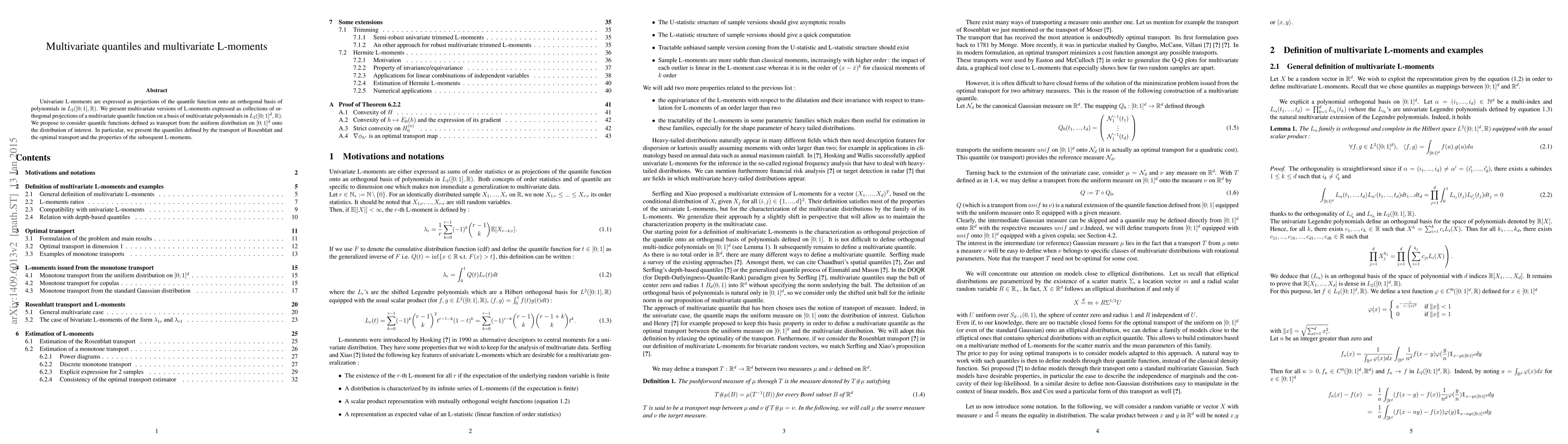 This paper introduces multivariate L-moments as orthogonal projections of multivariate quantile functions onto a basis of multivariate polynomials. It explores quantile functions derived from transport mappings, including Rosenblatt and optimal transport, and discusses their properties.