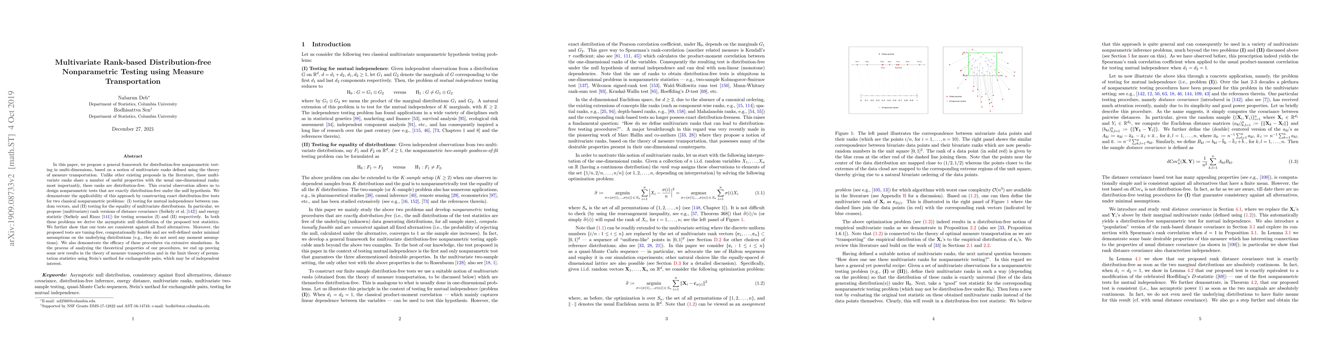 This paper introduces a distribution-free nonparametric testing framework using multivariate ranks based on measure transportation, proposing exact tests for mutual independence and equality of multivariate distributions. The tests are consistent, tuning-free, and require minimal distributional assumptions, with new theoretical results in measure transportation and permutation statistics as a byproduct.