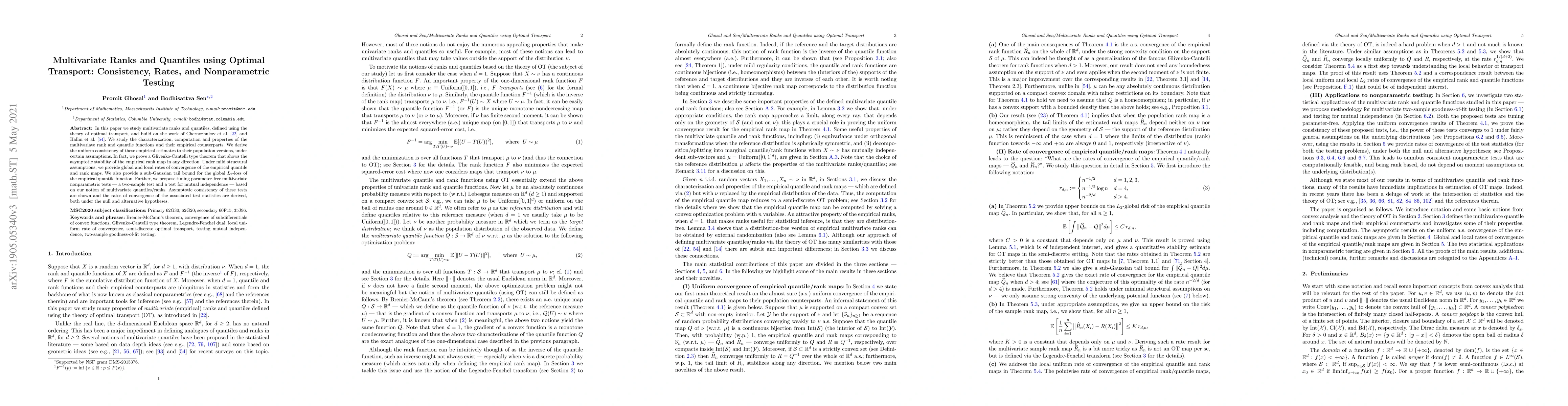This paper investigates multivariate ranks and quantiles defined via optimal transport, proving their uniform consistency and deriving convergence rates. It also introduces tuning parameter-free nonparametric tests for two-sample and mutual independence, demonstrating their asymptotic consistency.