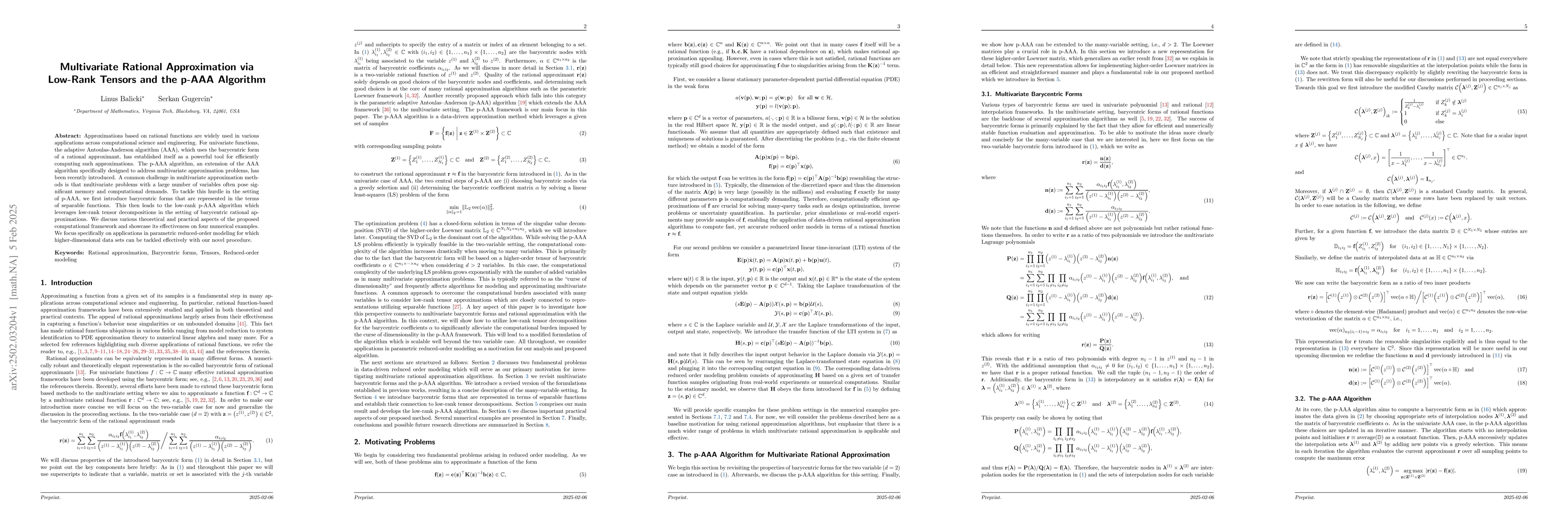 The research introduces barycentric forms of separable functions in the context of p-AAA algorithm, then develops a low-rank p-AAA algorithm using tensor decompositions for efficient multivariate rational approximations.