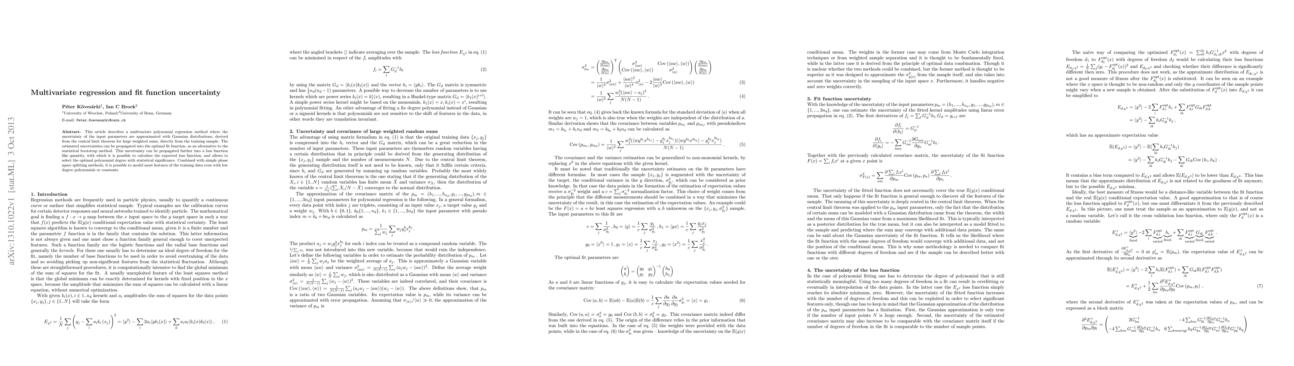 This research introduces a multivariate polynomial regression method that estimates input parameter uncertainties via Gaussian distributions from training samples. It offers an alternative to the bootstrap method for propagating these uncertainties into fit functions and loss quantities, enabling selection of optimal polynomial degrees with statistical significance. This approach, combined with phase space splitting, effectively models training data features using low-degree polynomials or constants.