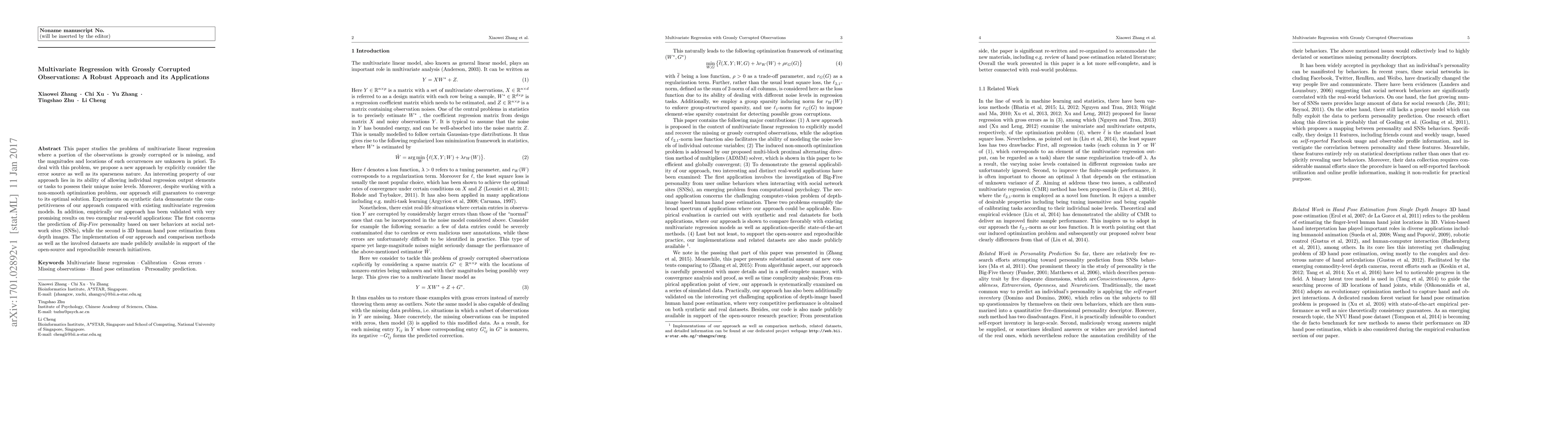 This paper proposes a robust multivariate regression approach to handle grossly corrupted or missing observations, allowing individual regression tasks unique noise levels. The method converges to an optimal solution and shows promising results in predicting personality traits and estimating human hand poses.