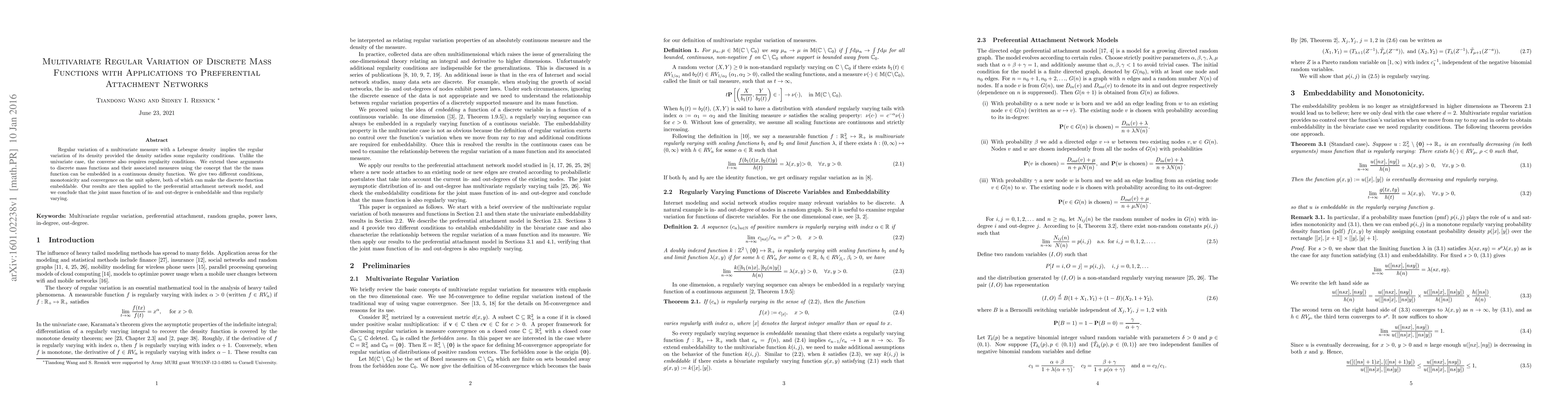 Regular variation of a multivariate measure with a Lebesgue density implies the regular variation of its density provided the density satisfies some regularity conditions. Unlike the univariate case, the converse also requires regularity conditions. We extend these arguments to discrete mass functions and their associated measures using the concept that the the mass function can be embedded in a continuous density function. We give two different conditions, monotonicity and convergence on the unit sphere, both of which can make the discrete function embeddable. Our results are then applied to the preferential attachment network model, and we conclude that the joint mass function of in- and out-degree is embeddable and thus regularly varying.
