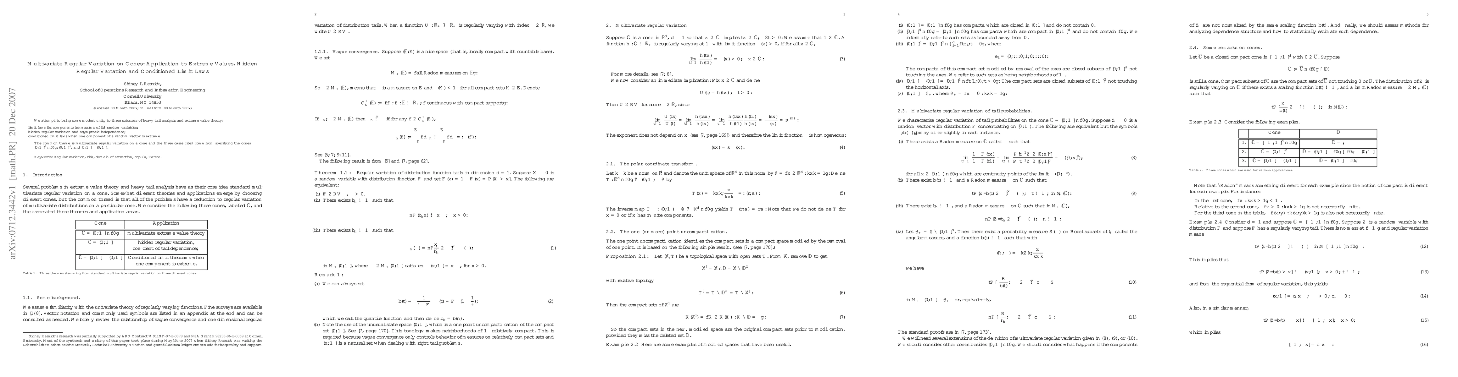 We attempt to bring some modest unity to three subareas of heavy tail analysis and extreme value theory: limit laws for componentwise maxima of iid random variables;hidden regular variation and asymptotic independence;conditioned limit laws when one component of a random vector is extreme. The common theme is multivariate regular variation on a cone and the three cases cited come from specifying the cones $[0,\infty]^d\setminus \{\boldsymbol 0\};(0,\infty]^d;$ and $[0,\infty]\times (0,\infty]$.