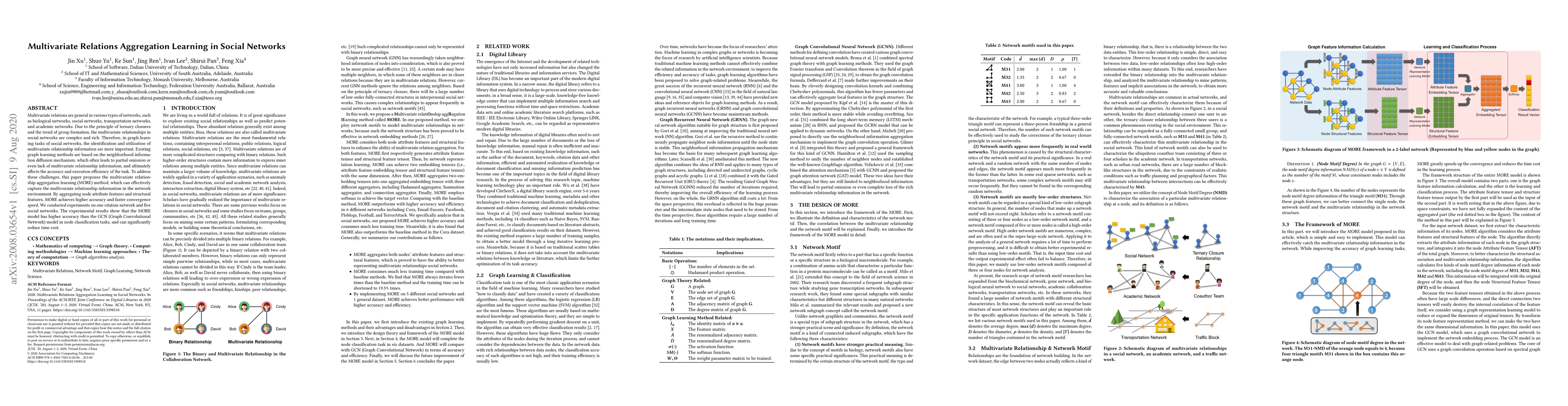 Multivariate relations are general in various types of networks, such as biological networks, social networks, transportation networks, and academic networks. Due to the principle of ternary closures and the trend of group formation, the multivariate relationships in social networks are complex and rich. Therefore, in graph learning tasks of social networks, the identification and utilization of multivariate relationship information are more important. Existing graph learning methods are based on the neighborhood information diffusion mechanism, which often leads to partial omission or even lack of multivariate relationship information, and ultimately affects the accuracy and execution efficiency of the task. To address these challenges, this paper proposes the multivariate relationship aggregation learning (MORE) method, which can effectively capture the multivariate relationship information in the network environment. By aggregating node attribute features and structural features, MORE achieves higher accuracy and faster convergence speed. We conducted experiments on one citation network and five social networks. The experimental results show that the MORE model has higher accuracy than the GCN (Graph Convolutional Network) model in node classification tasks, and can significantly reduce time cost.