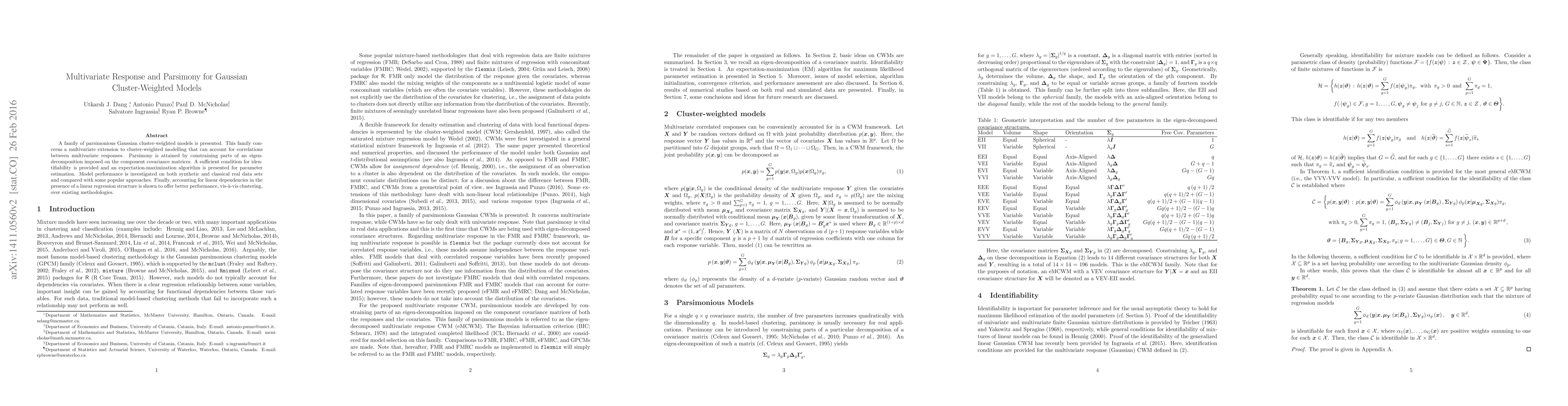 This paper introduces a parsimonious Gaussian cluster-weighted model for multivariate responses, achieving parsimony through eigen-decomposition constraints. An expectation-maximization algorithm is developed for parameter estimation, and the model's performance is shown to outperform existing methods in clustering tasks.