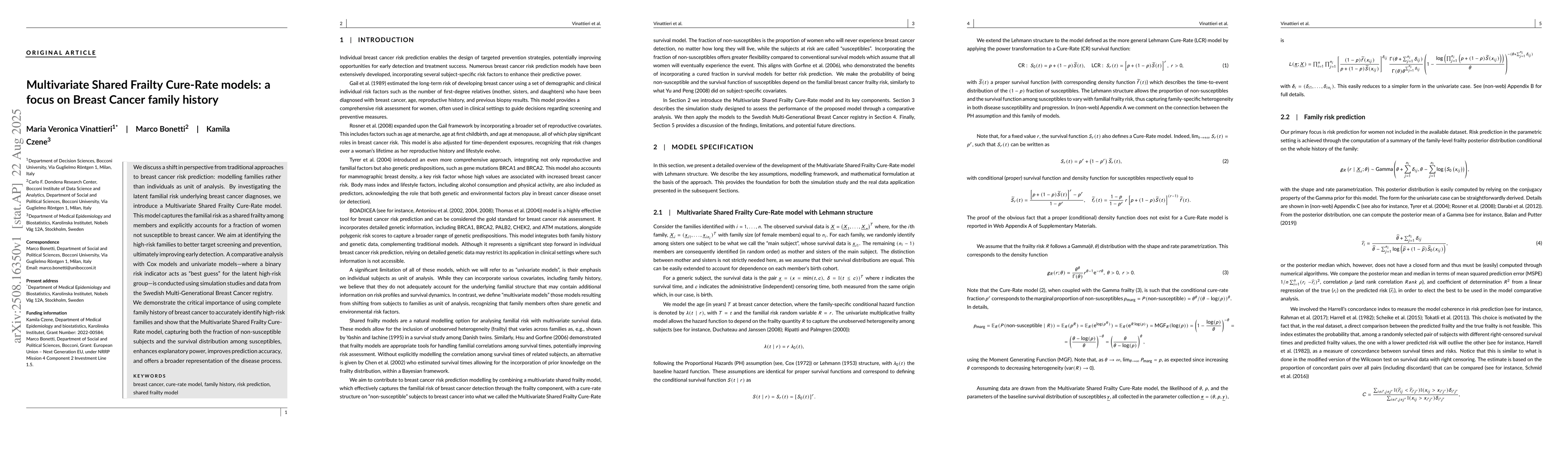 We discuss a shift in perspective from traditional approaches to breast cancer risk prediction: modelling families rather than individuals as unit of analysis. By investigating the latent familial risk underlying breast cancer diagnoses, we introduce a Multivariate Shared Frailty Cure-Rate model. This model captures the familial risk as a shared frailty among members and explicitly accounts for a fraction of women not susceptible to breast cancer. We aim at identifying the high-risk families to better target screening and prevention, ultimately improving early detection. A comparative analysis with Cox models and univariate models - where a binary risk indicator acts as best guess for the latent high-risk group - is conducted using simulation studies and data from the Swedish Multi-Generational Breast Cancer registry. We demonstrate the critical importance of using complete family history of breast cancer to accurately identify high-risk families and show that the Multivariate Shared Frailty Cure-Rate model, capturing both the fraction of non-susceptible subjects and the survival distribution among susceptibles, enhances explanatory power, improves prediction accuracy, and offers a broader representation of the disease process.