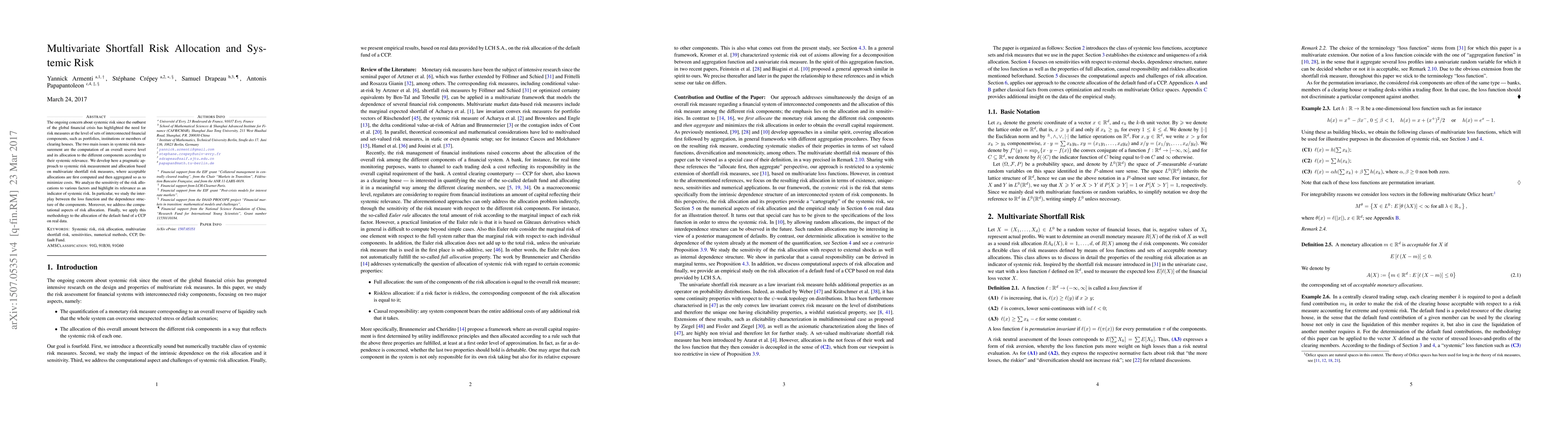 This paper develops a systematic approach to measure and allocate systemic risk using multivariate shortfall risk measures. It focuses on minimizing allocation costs while analyzing the sensitivity of these allocations to factors like loss functions and dependence structures, and applies the methodology to the default fund allocation in clearing houses.
