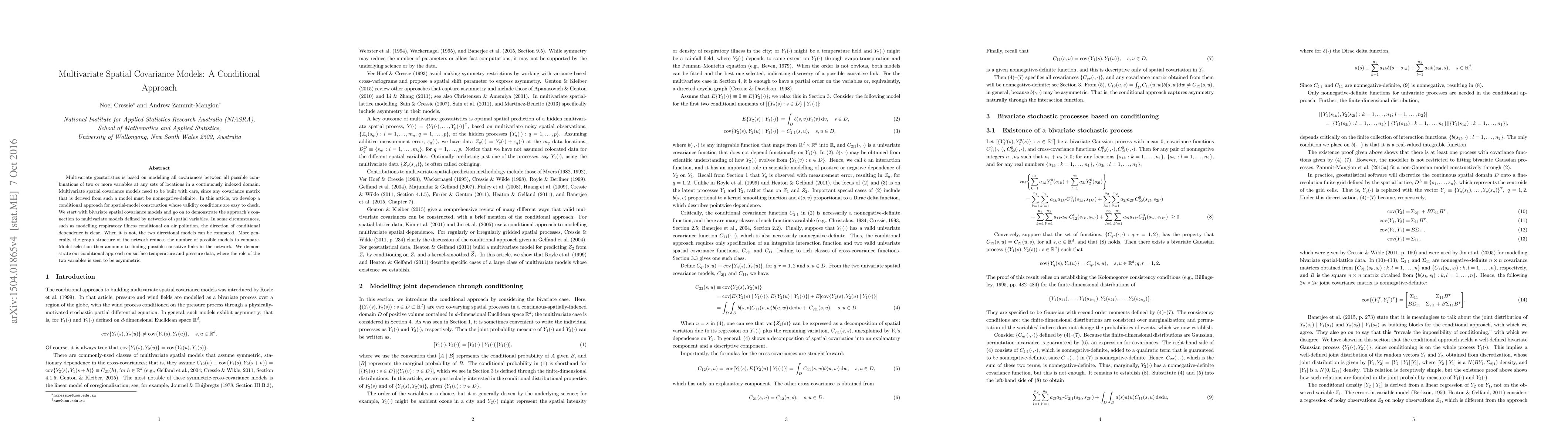 This paper develops a conditional approach for constructing multivariate spatial covariance models, ensuring the derived covariance matrices are nonnegative-definite. The method is demonstrated through bivariate and multivariate models, showing its applicability in asymmetric variable scenarios like surface temperature and pressure data.