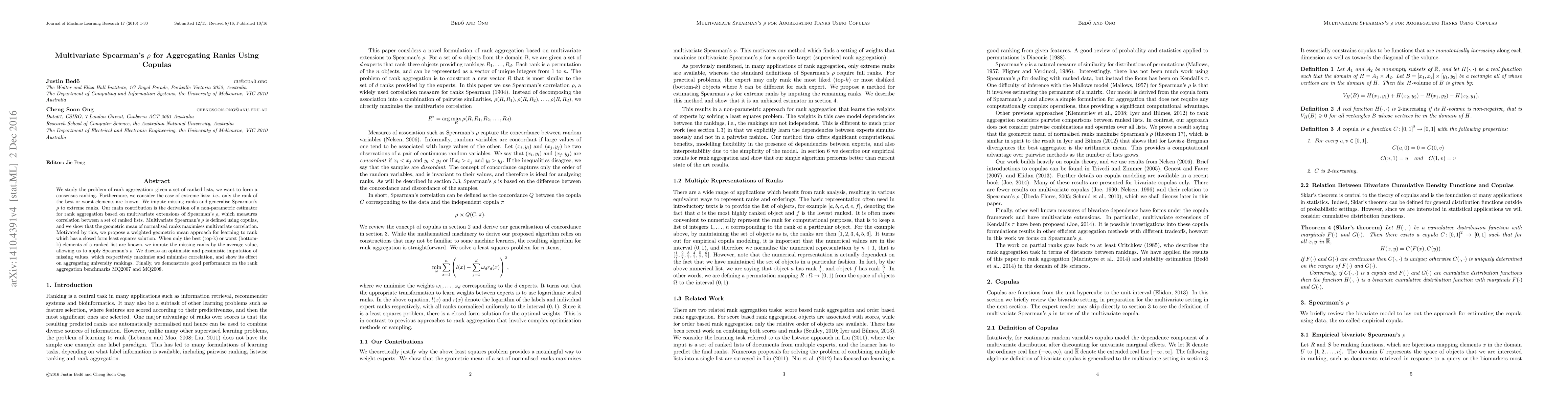 We study the problem of rank aggregation: given a set of ranked lists, we want to form a consensus ranking. Furthermore, we consider the case of extreme lists: i.e., only the rank of the best or worst elements are known. We impute missing ranks by the average value and generalise Spearman's \rho to extreme ranks. Our main contribution is the derivation of a non-parametric estimator for rank aggregation based on multivariate extensions of Spearman's \rho, which measures correlation between a set of ranked lists. Multivariate Spearman's \rho is defined using copulas, and we show that the geometric mean of normalised ranks maximises multivariate correlation. Motivated by this, we propose a weighted geometric mean approach for learning to rank which has a closed form least squares solution. When only the best or worst elements of a ranked list are known, we impute the missing ranks by the average value, allowing us to apply Spearman's \rho. Finally, we demonstrate good performance on the rank aggregation benchmarks MQ2007 and MQ2008.