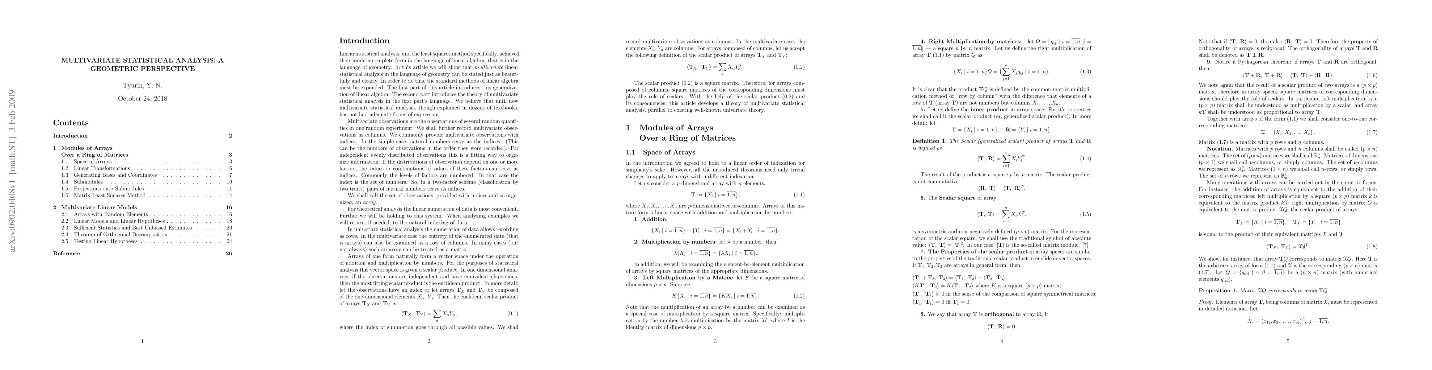 This paper introduces a geometric, coordinate-free approach to multivariate statistical analysis, defining general linear models and hypotheses in geometric form and developing statistical criteria analogous to classical methods using tensor products and modules over matrix rings.