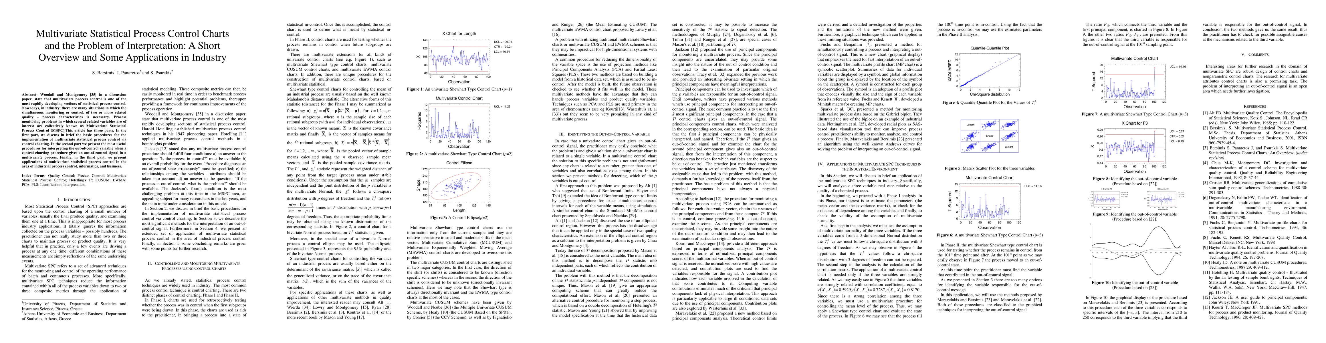 This paper provides an overview of Multivariate Statistical Process Control (MSPC) and its implementation through control charting. It discusses methods for interpreting out-of-control signals and presents applications in industrial process control, informatics, and business.