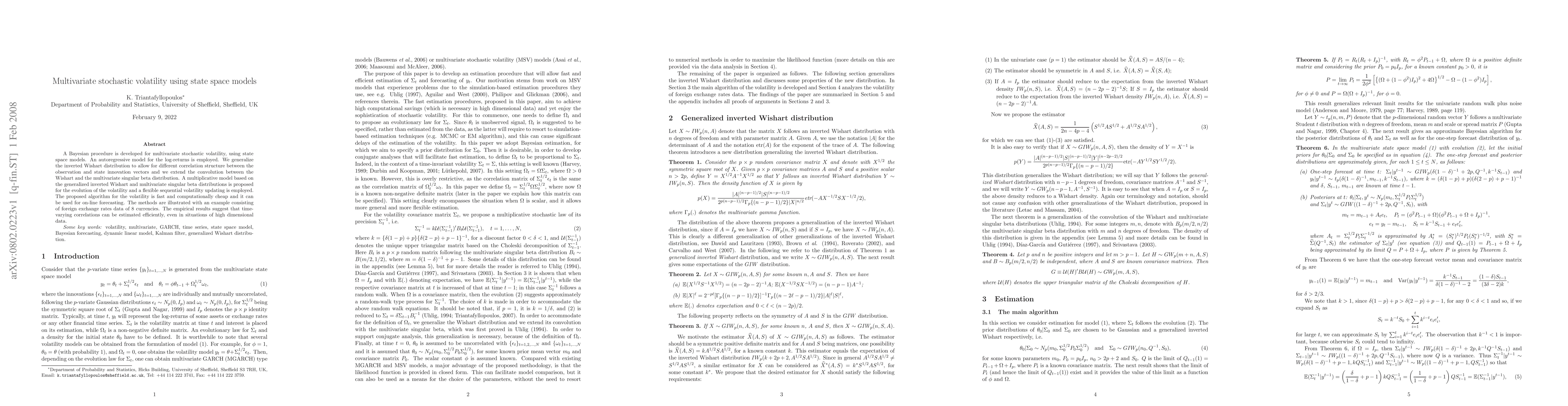 A Bayesian procedure is developed for multivariate stochastic volatility, using state space models. An autoregressive model for the log-returns is employed. We generalize the inverted Wishart distribution to allow for different correlation structure between the observation and state innovation vectors and we extend the convolution between the Wishart and the multivariate singular beta distribution. A multiplicative model based on the generalized inverted Wishart and multivariate singular beta distributions is proposed for the evolution of the volatility and a flexible sequential volatility updating is employed. The proposed algorithm for the volatility is fast and computationally cheap and it can be used for on-line forecasting. The methods are illustrated with an example consisting of foreign exchange rates data of 8 currencies. The empirical results suggest that time-varying correlations can be estimated efficiently, even in situations of high dimensional data.