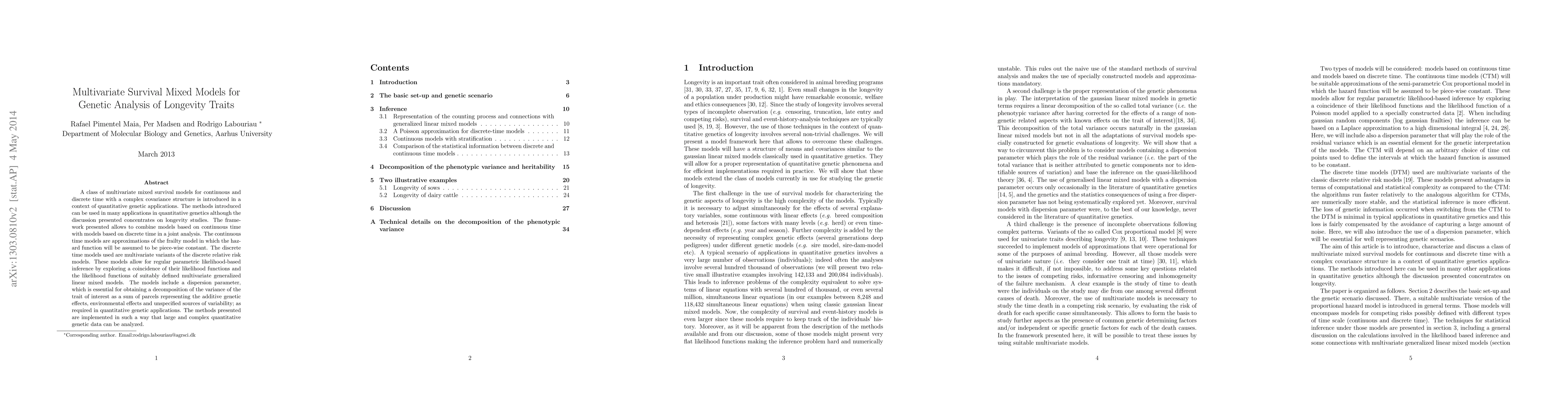 This paper introduces multivariate mixed survival models for genetic analysis of longevity traits, combining continuous and discrete time frameworks. The proposed models facilitate the decomposition of variance into genetic, environmental, and unspecified components, enabling efficient analysis of large genetic datasets.