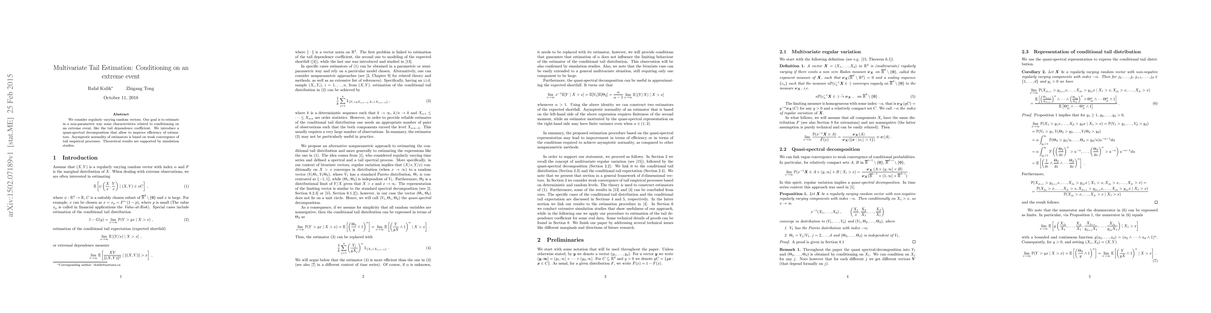 We consider regularly varying random vectors. Our goal is to estimate in a non-parametric way some characteristics related to conditioning on an extreme event, like the tail dependence coefficient. We introduce a quasi-spectral decomposition that allow to improve efficiency of estimators. Asymptotic normality of estimators is based on weak convergence of tail empirical processes. Theoretical results are supported by simulation studies.