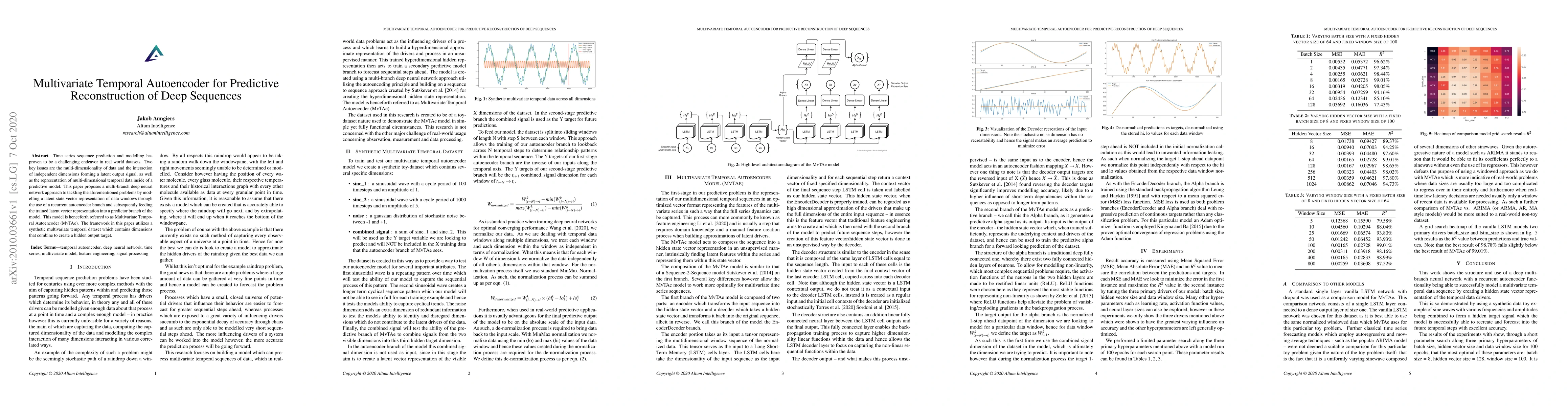 Time series sequence prediction and modelling has proven to be a challenging endeavor in real world datasets. Two key issues are the multi-dimensionality of data and the interaction of independent dimensions forming a latent output signal, as well as the representation of multi-dimensional temporal data inside of a predictive model. This paper proposes a multi-branch deep neural network approach to tackling the aforementioned problems by modelling a latent state vector representation of data windows through the use of a recurrent autoencoder branch and subsequently feeding the trained latent vector representation into a predictor branch of the model. This model is henceforth referred to as Multivariate Temporal Autoencoder (MvTAe). The framework in this paper utilizes a synthetic multivariate temporal dataset which contains dimensions that combine to create a hidden output target.