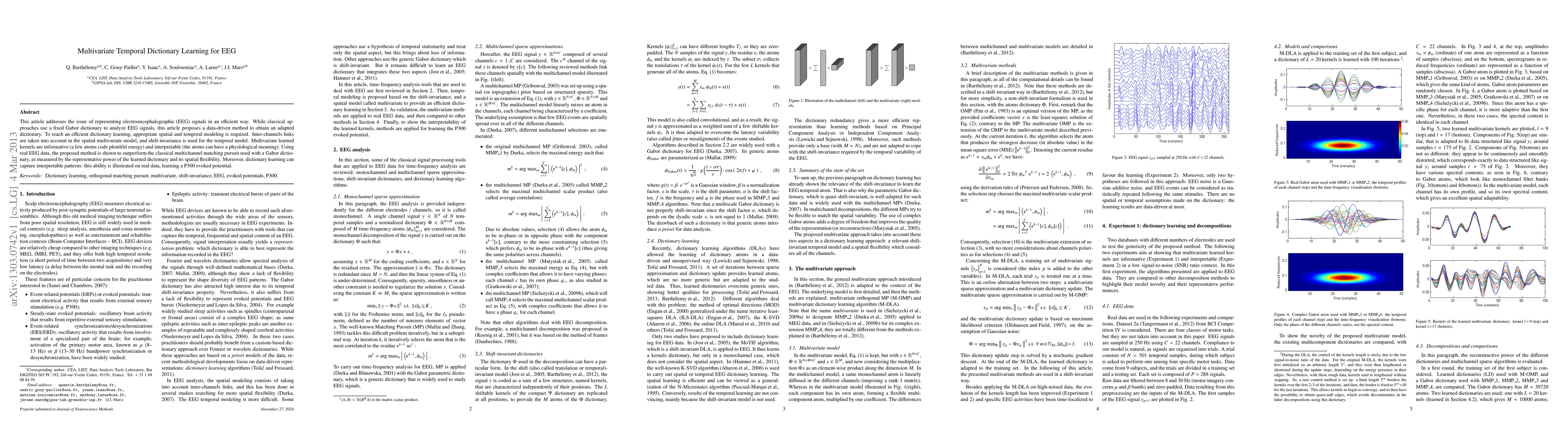 This paper proposes a data-driven multivariate temporal dictionary learning method for efficient EEG signal representation, outperforming classical Gabor dictionary methods. The method captures interpretable physiological patterns, demonstrated through the learning of P300 evoked potentials.