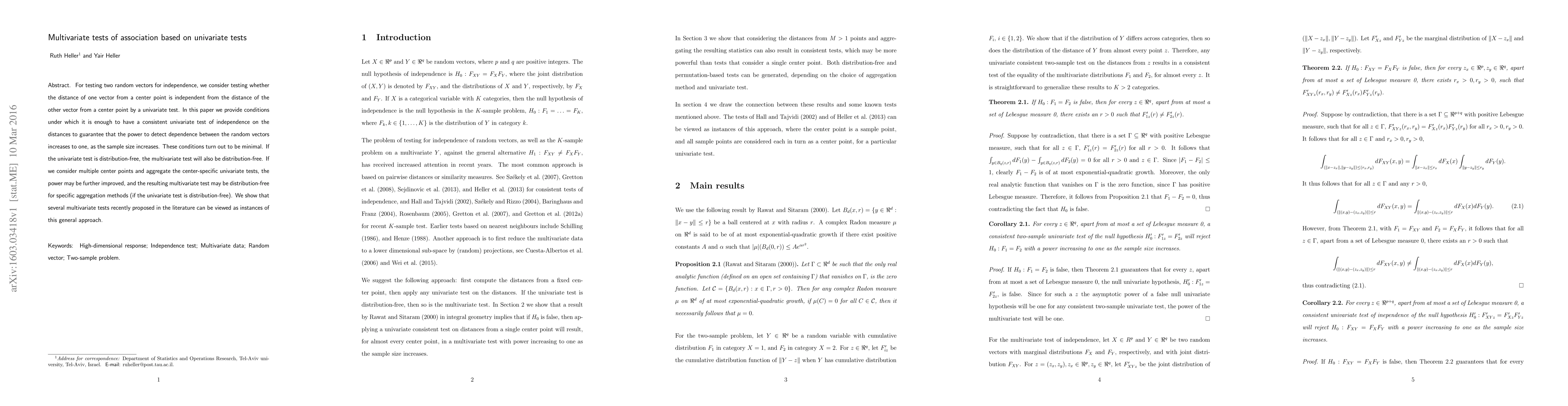 This paper explores multivariate tests of association based on univariate tests, demonstrating that consistent univariate tests can guarantee increasing power to detect dependence as sample size grows, especially when using multiple center points and specific aggregation methods. It also shows that several existing multivariate tests can be framed within this general approach.