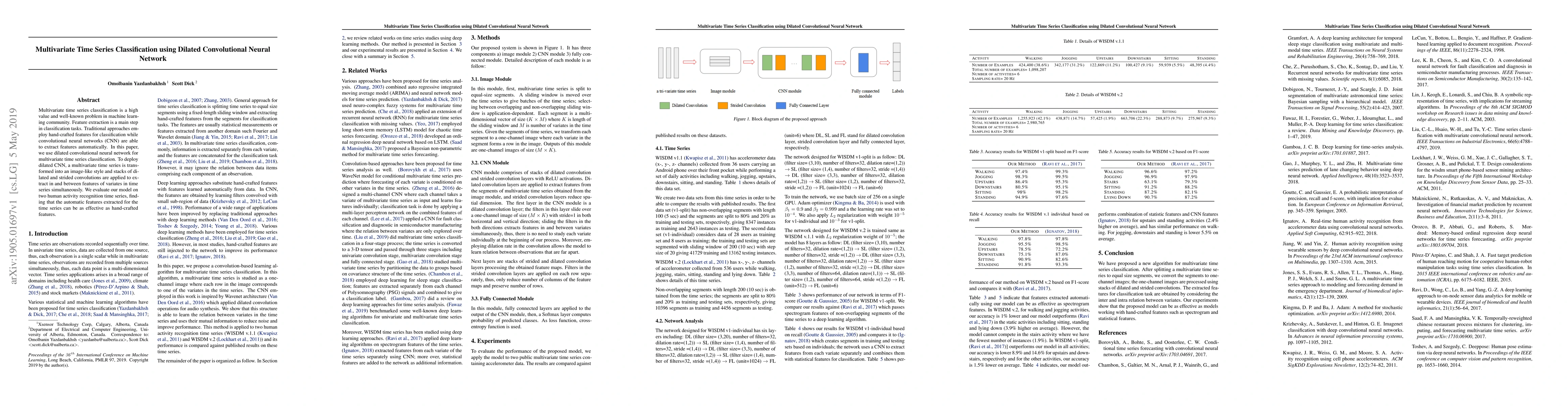 This paper proposes a dilated convolutional neural network (CNN) for multivariate time series classification, transforming time series into image-like data and utilizing dilated and strided convolutions for feature extraction. The approach shows comparable effectiveness to traditional hand-crafted feature methods in classifying human activity recognition time series.
