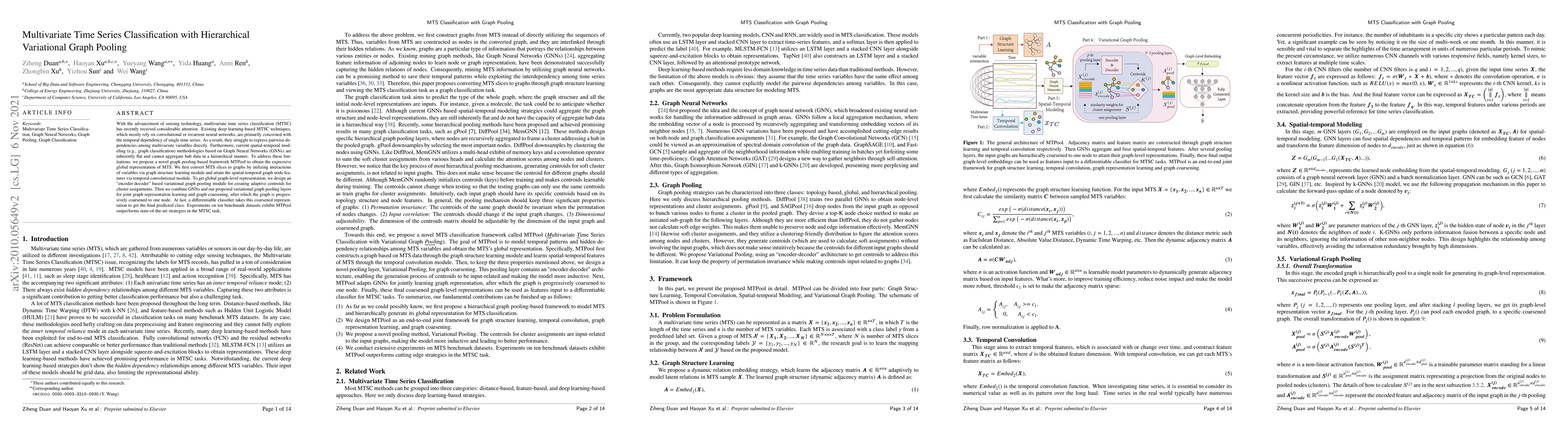 The paper proposes MTPool, a novel hierarchical variational graph pooling framework for multivariate time series classification (MTSC). It employs graph structure learning and temporal convolutional modules to capture spatial-temporal dependencies, followed by variational graph pooling for adaptive clustering and global graph representation, ultimately achieving superior performance on benchmark datasets.