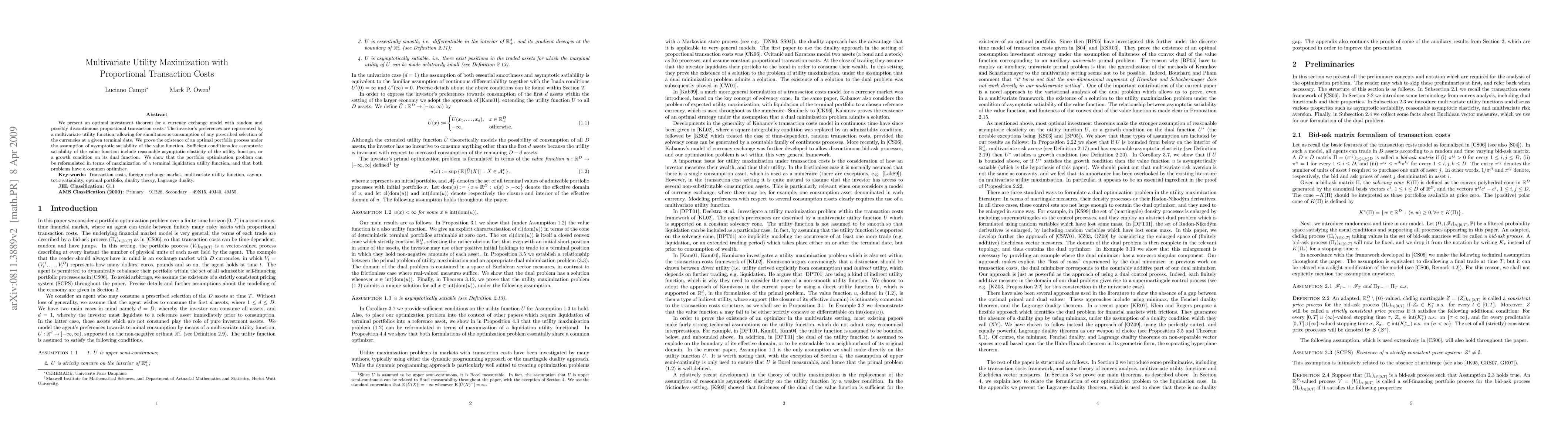 This paper develops an optimal investment theorem for a currency exchange model with proportional transaction costs, proving the existence of an optimal portfolio process under conditions of asymptotic satiability. The investor's utility is represented by a multivariate function, and the portfolio optimization problem is reformulated to maximize a terminal liquidation utility function.