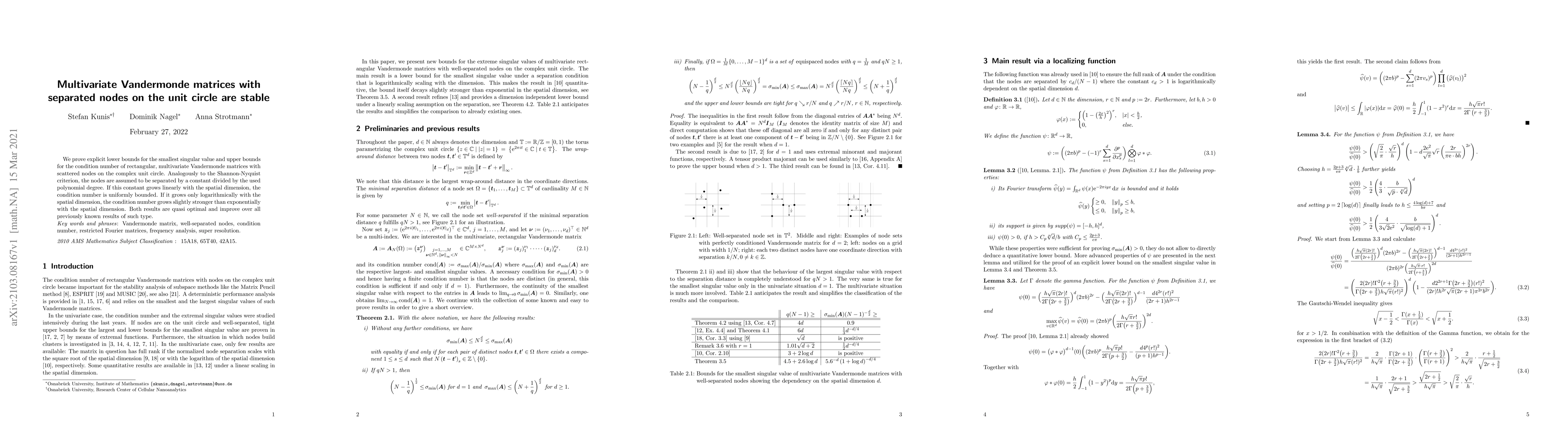 This paper establishes explicit bounds for the smallest singular value and condition number of multivariate Vandermonde matrices with nodes on the unit circle, showing stability under certain separation conditions. The condition number is uniformly bounded if the separation grows linearly with dimension, and it grows slightly stronger than exponentially if it grows logarithmically, outperforming previous results.
