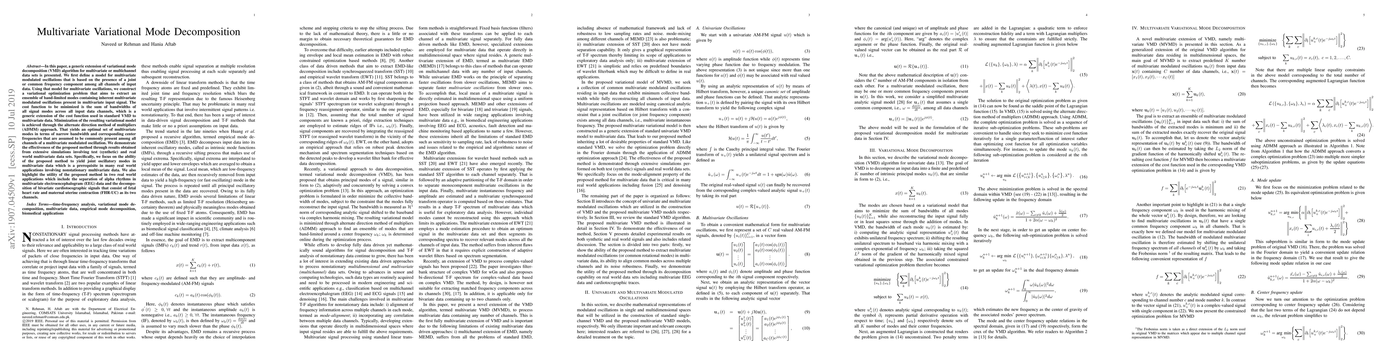 This paper extends variational mode decomposition (VMD) to multivariate data, introducing a method to extract band-limited modes with common frequency components across multiple channels. The proposed approach uses an optimization problem to minimize the sum of bandwidths, achieving optimal modes via the ADMM method, and demonstrates effectiveness through synthetic and real-world data applications, including EEG rhythm separation and cardiotocographic signal decomposition.