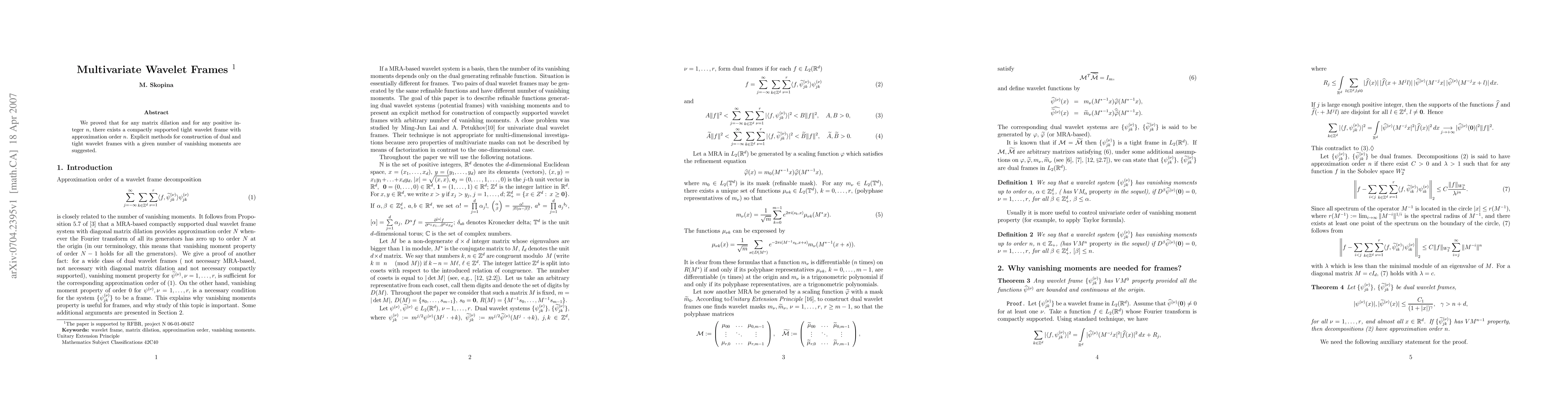 We proved that for any matrix dilation and for any positive integer $n$, there exists a compactly supported tight wavelet frame with approximation order $n$. Explicit methods for construction of dual and tight wavelet frames with a given number of vanishing moments are suggested.