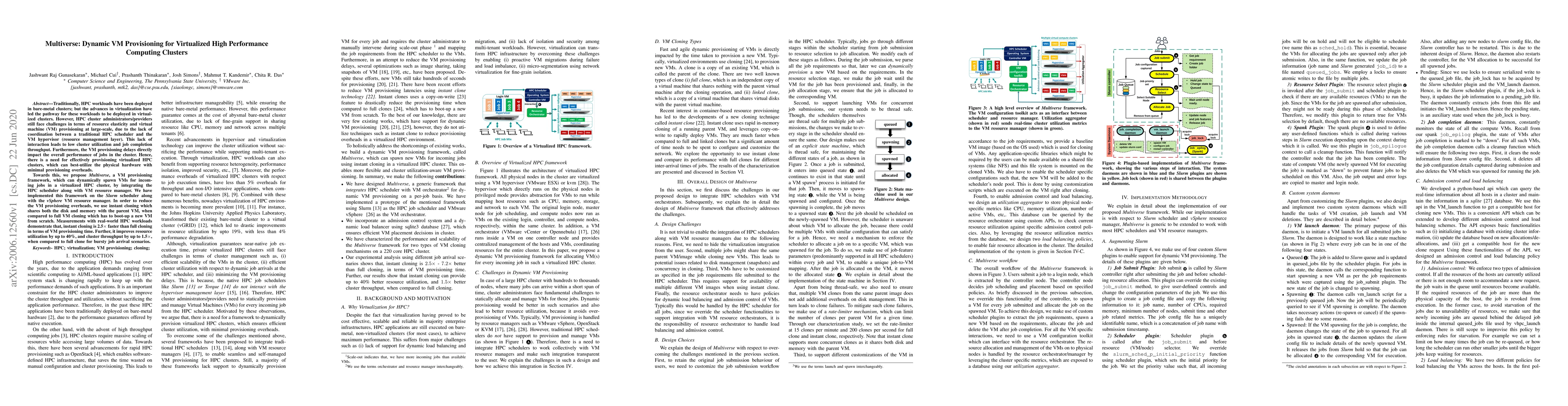 A new framework called Multiverse improves virtualized HPC cluster performance by dynamically provisioning VMs, reducing provisioning overheads and increasing resource utilization.