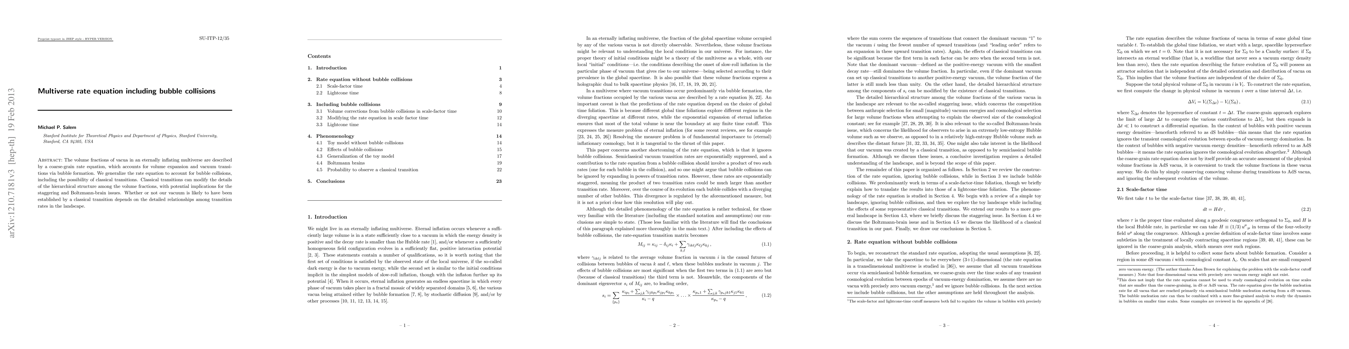 The volume fractions of vacua in an eternally inflating multiverse are described by a coarse-grain rate equation, which accounts for volume expansion and vacuum transitions via bubble formation. We generalize the rate equation to account for bubble collisions, including the possibility of classical transitions. Classical transitions can modify the details of the hierarchical structure among the volume fractions, with potential implications for the staggering and Boltzmann-brain issues. Whether or not our vacuum is likely to have been established by a classical transition depends on the detailed relationships among transition rates in the landscape.