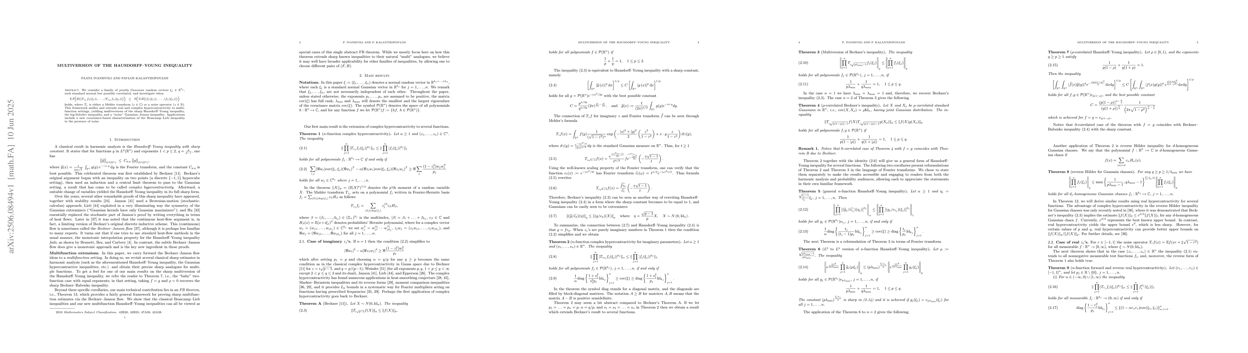 We consider a family of jointly Gaussian random vectors $\xi_j \in \mathbb{R}^{k_j}$, each standard normal but possibly correlated, and investigate when\[ \mathbb{E}\, F\!\Bigl(B\bigl(|T_{z_1} f_1(\xi_1)|,\dots,|T_{z_n} f_n(\xi_n)|\bigr)\Bigr) \;\;\le\;\; F\!\Bigl(\,\mathbb{E}\,B\bigl(|f_1(\xi_1)|,\dots,|f_n(\xi_n)|\bigr)\Bigr) \] holds, where $T_{z}$ is either a Mehler transform $(z \in \mathbb{C})$ or a noise operator $(z \in \mathbb{R})$. This framework unifies and extends real and complex hypercontractivity to multi-function settings, yielding multiversions of the sharp Hausdorff--Young inequality, the log-Sobolev inequality, and a noisy Gaussian--Jensen inequality. Applications include a new covariance-based characterization of the Brascamp--Lieb inequality in the presence of noise.