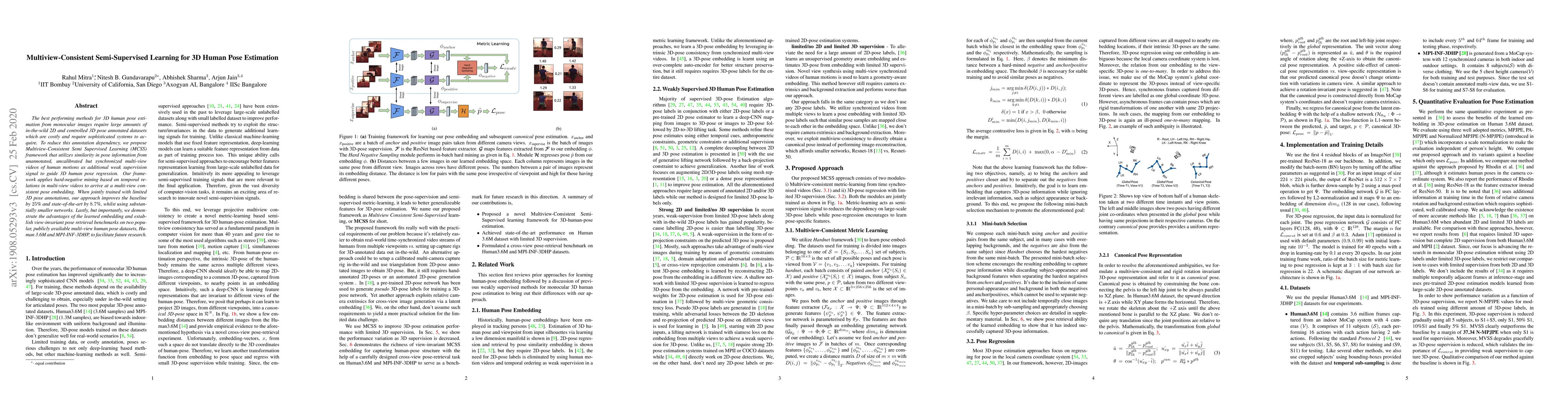 The best performing methods for 3D human pose estimation from monocular images require large amounts of in-the-wild 2D and controlled 3D pose annotated datasets which are costly and require sophisticated systems to acquire. To reduce this annotation dependency, we propose Multiview-Consistent Semi Supervised Learning (MCSS) framework that utilizes similarity in pose information from unannotated, uncalibrated but synchronized multi-view videos of human motions as additional weak supervision signal to guide 3D human pose regression. Our framework applies hard-negative mining based on temporal relations in multi-view videos to arrive at a multi-view consistent pose embedding. When jointly trained with limited 3D pose annotations, our approach improves the baseline by 25% and state-of-the-art by 8.7%, whilst using substantially smaller networks. Lastly, but importantly, we demonstrate the advantages of the learned embedding and establish view-invariant pose retrieval benchmarks on two popular, publicly available multi-view human pose datasets, Human 3.6M and MPI-INF-3DHP, to facilitate future research.