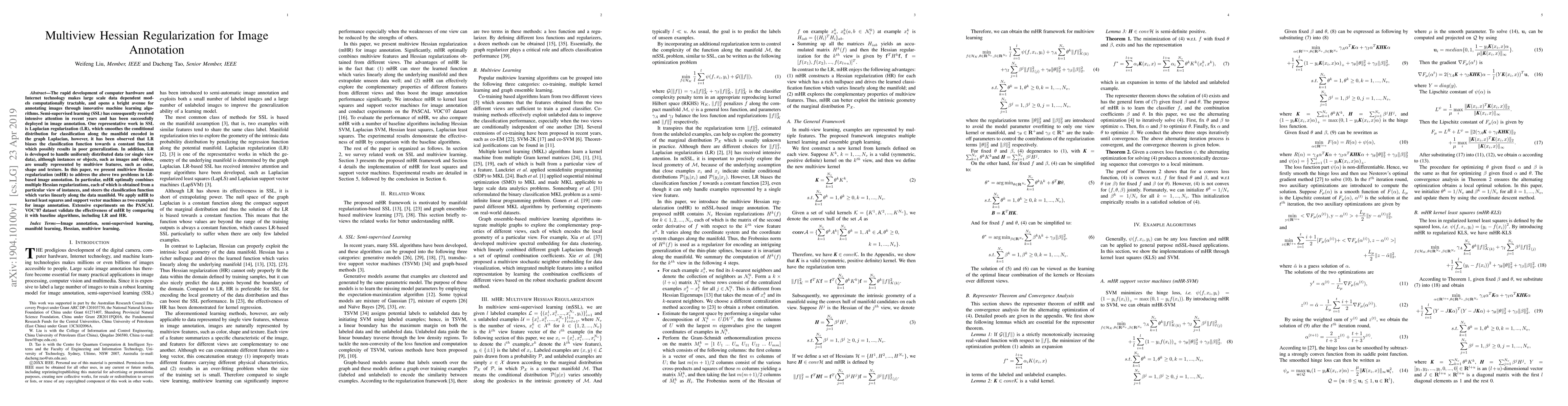 This paper proposes multiview Hessian regularization (mHR) to improve semi-supervised learning for image annotation, addressing the limitations of Laplacian regularization (LR) by combining multiple Hessian regularizations from different data views. Experiments on the PASCAL VOC'07 dataset demonstrate mHR's superior performance over traditional LR and single view HR methods.