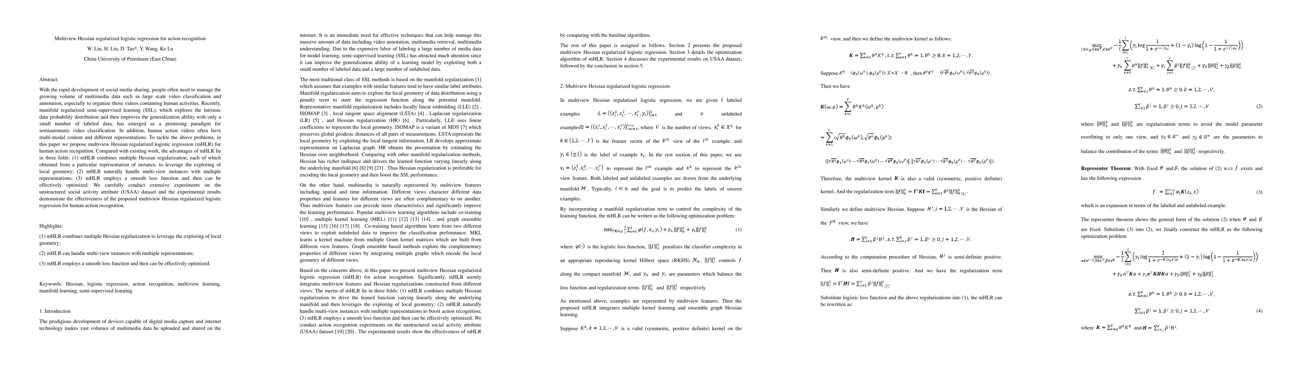 This paper proposes multiview Hessian regularized logistic regression (mHLR) for human action recognition, combining multiple Hessian regularization techniques to leverage local geometry and handle multi-view instances. Extensive experiments on the USAA dataset show its effectiveness in semiautomatic video classification.