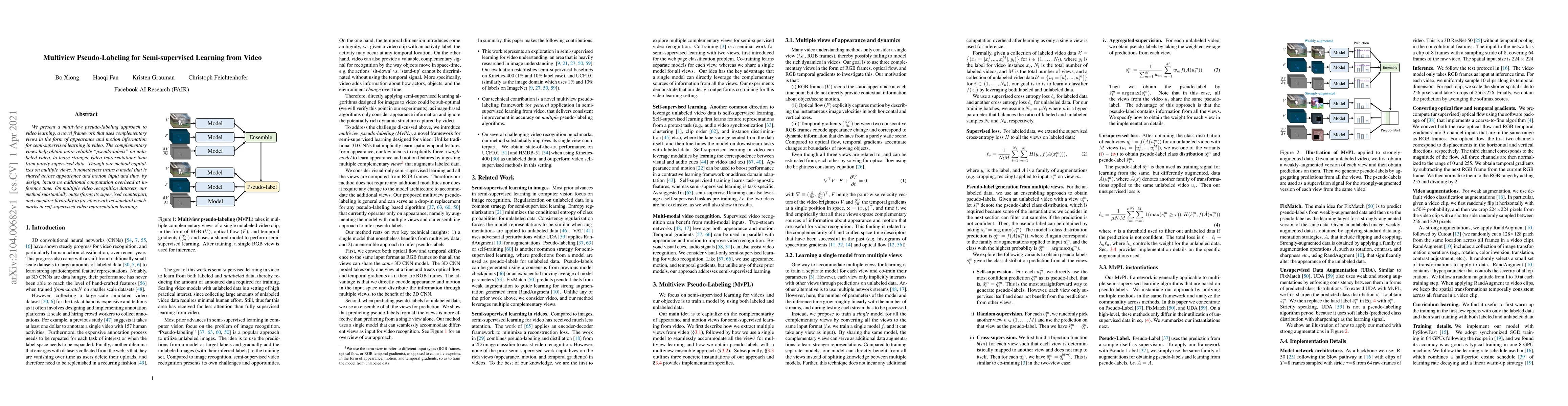 This paper introduces a multiview pseudo-labeling framework for semi-supervised learning in video, leveraging appearance and motion information to generate reliable pseudo-labels. The approach trains a shared model with no additional inference overhead, outperforming supervised methods and competing self-supervised techniques on video recognition tasks.