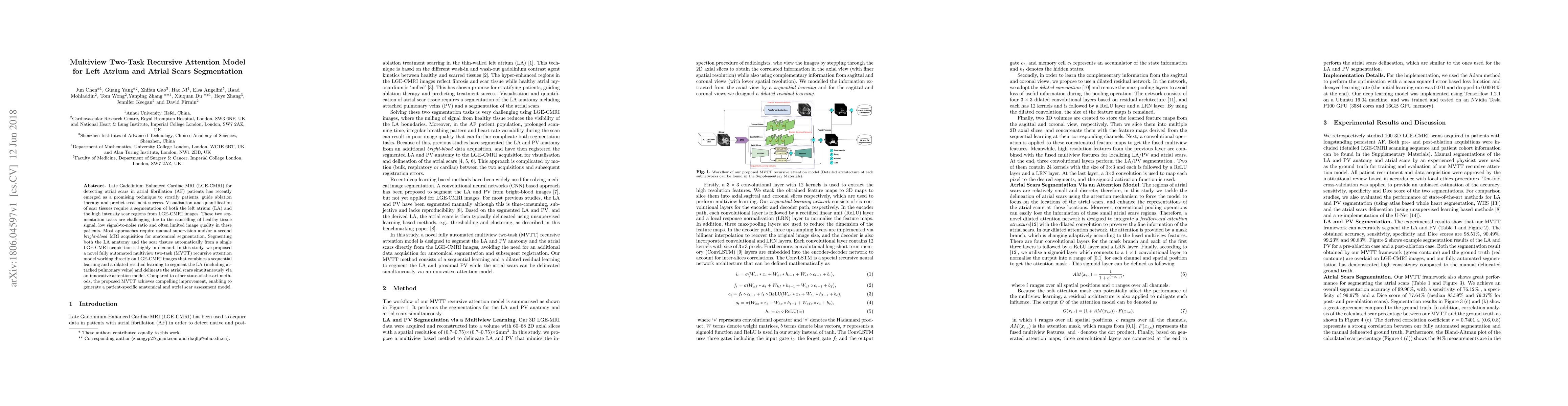 This paper proposes a novel multiview two-task recursive attention model for fully automated segmentation of the left atrium and atrial scars from Late Gadolinium Enhanced Cardiac MRI images. The model combines sequential and dilated residual learning to achieve simultaneous segmentation, outperforming existing methods.