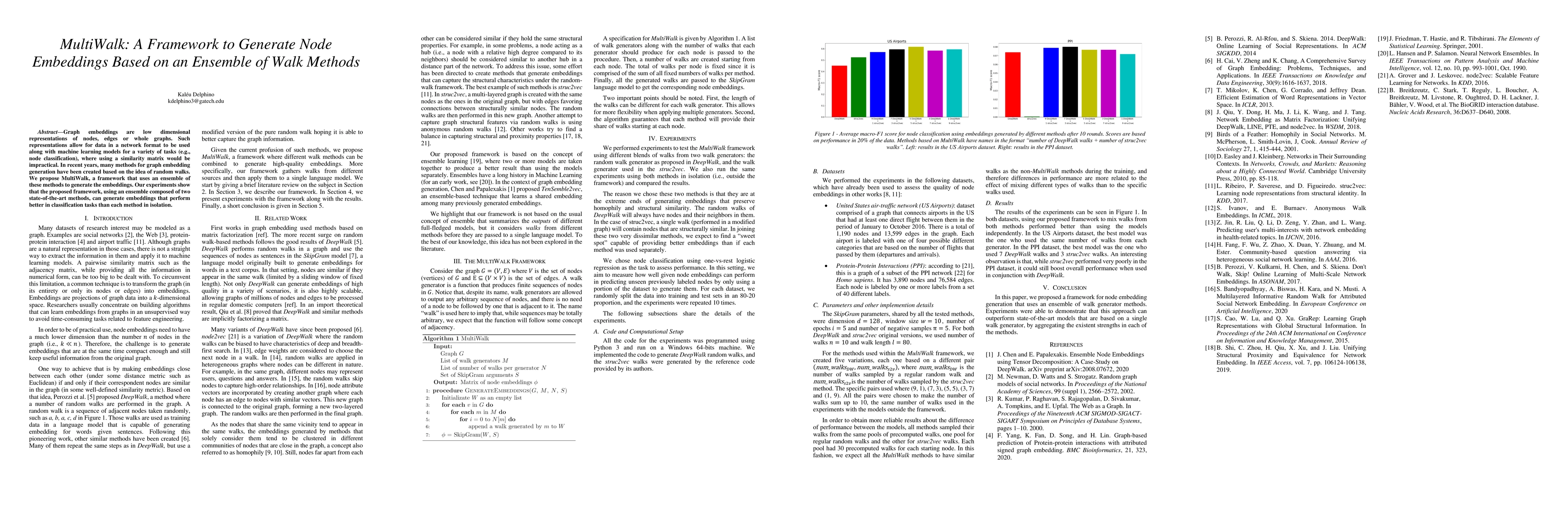 Graph embeddings are low dimensional representations of nodes, edges or whole graphs. Such representations allow for data in a network format to be used along with machine learning models for a variety of tasks (e.g., node classification), where using a similarity matrix would be impractical. In recent years, many methods for graph embedding generation have been created based on the idea of random walks. We propose MultiWalk, a framework that uses an ensemble of these methods to generate the embeddings. Our experiments show that the proposed framework, using an ensemble composed of two state-of-the-art methods, can generate embeddings that perform better in classification tasks than each method in isolation.