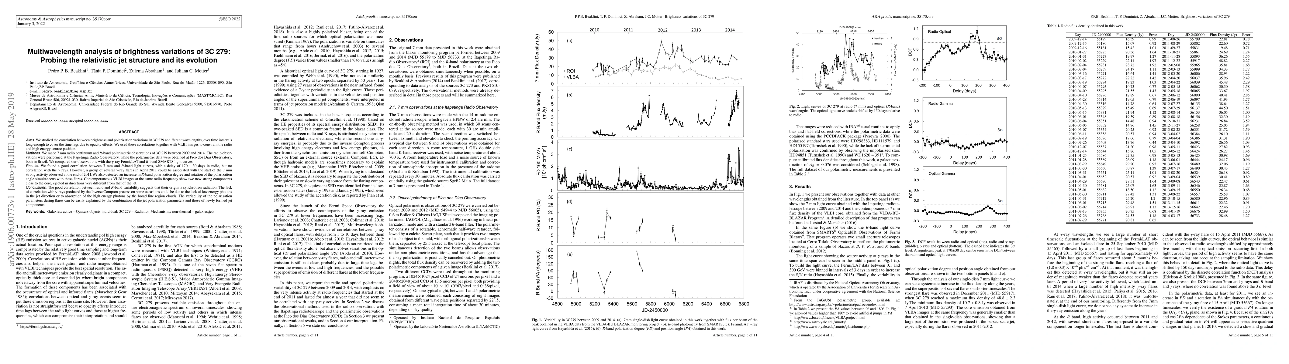 This study examines 3C~279's brightness and polarization variations across multiple wavelengths, revealing a strong correlation between 7 mm radio and R-band light curves with a 170-day radio delay. The research also links specific gamma-ray flares in 2011 to subsequent strong radio activity and changes in polarization parameters, suggesting synchrotron radiation origins. The findings hint at possible absorption of high-energy photons by broad line region clouds and varying jet polarization parameters.