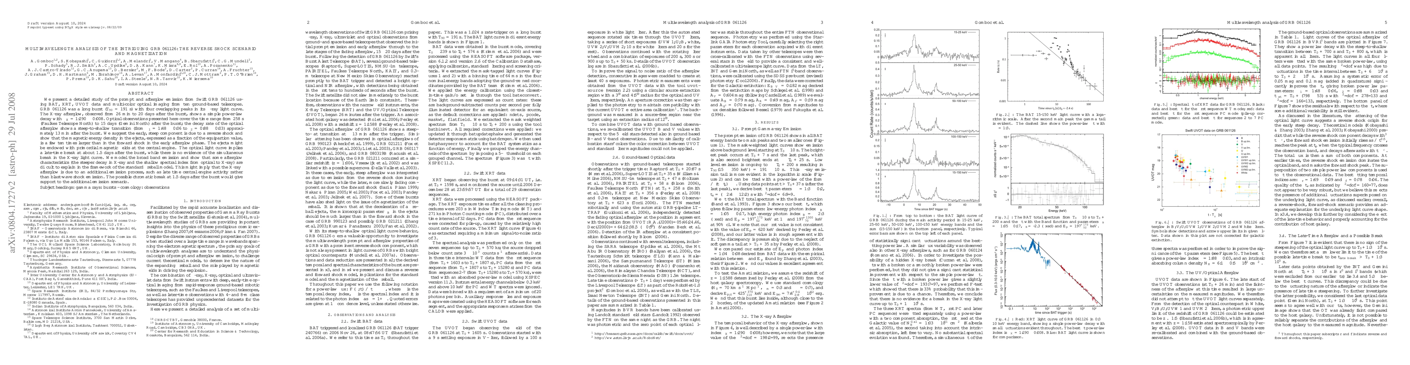 We present a detailed study of the prompt and afterglow emission from Swift GRB 061126 using BAT, XRT, UVOT data and multi-color optical imaging from ten ground-based telescopes. GRB 061126 was a long burst (T_90=191 s) with four overlapping peaks in its gamma-ray light curve. The X-ray afterglow, observed from 26 min to 20 days after the burst, shows a simple power-law decay with alpha_X=1.290 \pm 0.008. Optical observations presented here cover the time range from 258 s (Faulkes Telescope North) to 15 days (Gemini North) after the burst; the decay rate of the optical afterglow shows a steep-to-shallow transition (from alpha_1=1.48 \pm 0.06 to alpha_2=0.88 \pm 0.03) approximately 13 min after the burst. We suggest the early, steep component is due to a reverse shock and show that the magnetic energy density in the ejecta, expressed as a fraction of the equipartion value, is a few ten times larger than in the forward shock in the early afterglow phase. The ejecta might be endowed with primordial magnetic fields at the central engine. The optical light curve implies a late-time break at about 1.5 days after the burst, while there is no evidence of the simultaneous break in the X-ray light curve. We model the broad band emission and show that some afterglow characteristics (the steeper decay in X-ray and the shallow spectral index from optical to X-ray) are difficult to explain in the framework of the standard fireball model. This might imply that the X-ray afterglow is due to an additional emission process, such as late time central engine activity rather than blast-wave shock emission. The possible chromatic break at 1.5 days after the burst would give support to the additional emission scenario.