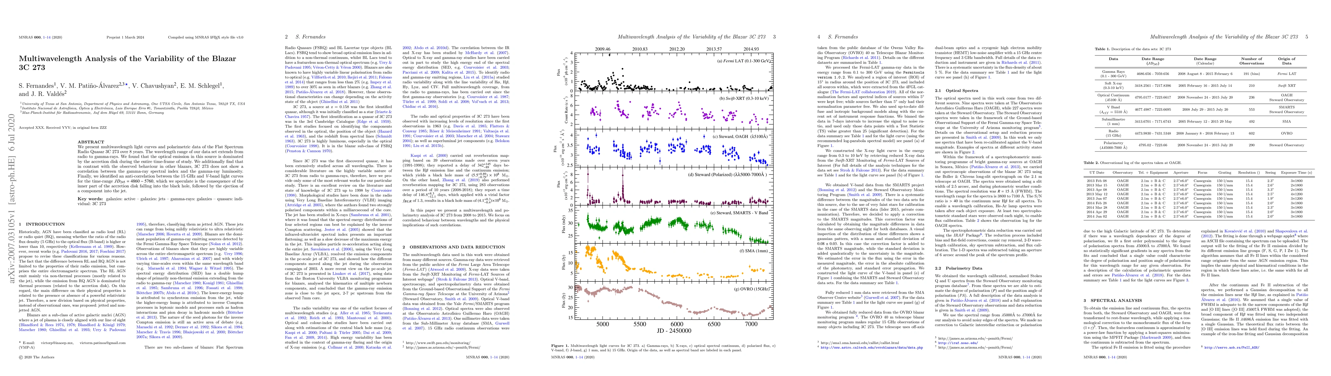 This study presents multiwavelength light curves and polarimetric data of the blazar 3C 273 over 8 years, revealing that optical emission is dominated by the accretion disk. Notably, 3C 273 does not correlate gamma-ray spectral index with luminosity, unlike other blazars, and shows an anti-correlation between 15 GHz and V-band light curves, suggesting disk-black hole interactions.