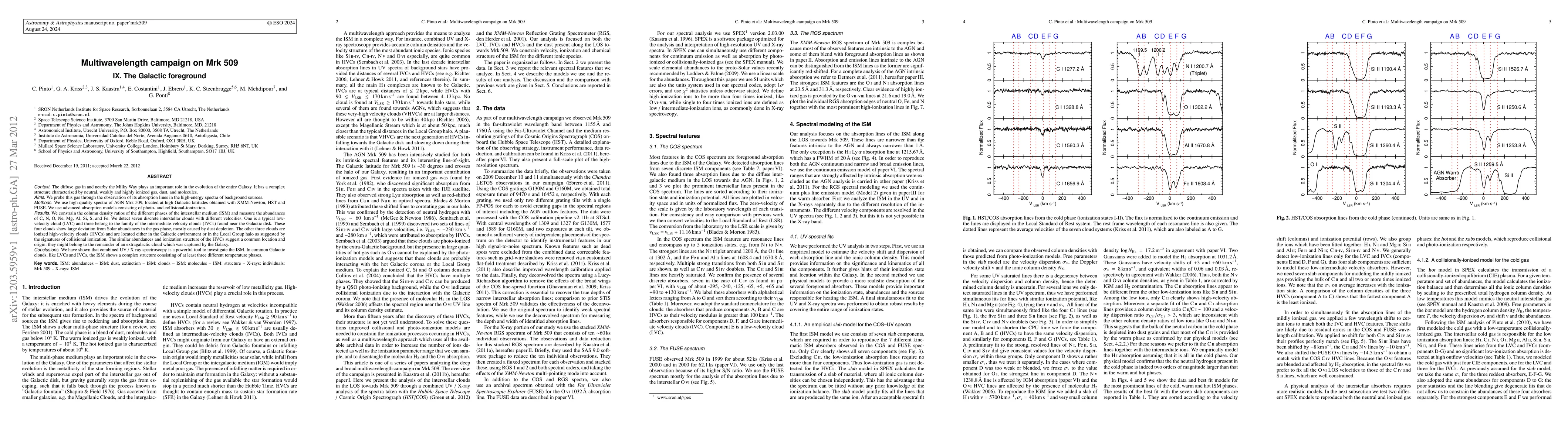 The diffuse gas in and nearby the Milky Way plays an important role in the evolution of the entire Galaxy. It has a complex structure characterized by neutral, weakly and highly ionized gas, dust, and molecules. We probe this gas through the observation of its absorption lines in the high-energy spectra of background sources. We use high-quality spectra of AGN Mrk 509, located at high Galactic latitudes obtained with XMM-Newton, HST and FUSE. We use advanced absorption models consisting of photo- and collisional-ionization. We constrain the column density ratios of the different phases of the interstellar medium (ISM) and measure the abundances of C, N, O, Ne, Mg, Al, Si, S, and Fe. We detect seven discrete interstellar clouds with different velocities. One is a typical low-velocity cloud (LVC) and three belong to the family of the intermediate-velocity clouds (IVCs) found near the Galactic disk. These four clouds show large deviation from Solar abundances in the gas phase, mostly caused by dust depletion. The other three clouds are ionized high-velocity clouds (HVCs) and are located either in the Galactic environment or in the Local Group halo as suggested by the signatures of collisional ionization. The similar abundances and ionization structure of the HVCs suggest a common location and origin: they might belong to the remainder of an extragalactic cloud which was captured by the Galaxy. We have shown that combined UV / X-ray spectroscopy is a powerful tool to investigate the ISM. In common Galactic clouds, like LVCs and IVCs, the ISM shows a complex structure consisting of at least three different temperature phases.