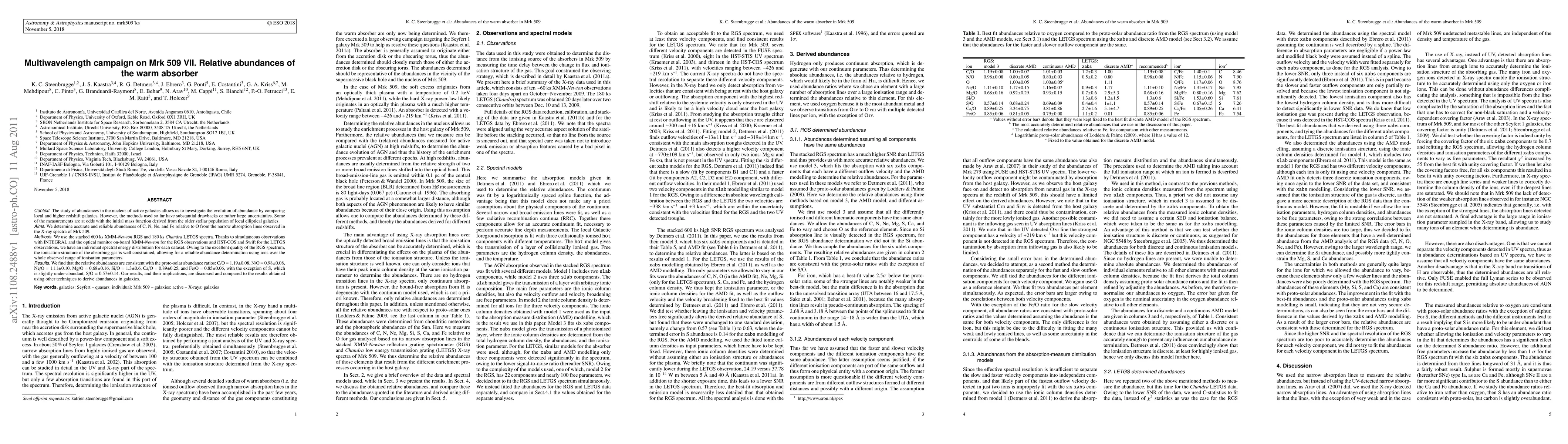 Context. The study of abundances in the nucleus of active galaxies allows us to investigate the evolution of abundance by comparing local and higher redshift galaxies. However, the methods used so far have substantial drawbacks or rather large uncertainties. Some of the measurements are at odds with the initial mass function derived from the older stellar population of local elliptical galaxies. Aims. We determine accurate and reliable abundances of C, N, Ne, and Fe relative to O from the narrow absorption lines observed in the X-ray spectra of Mrk 509. Methods. We use the stacked 600 ks XMM-Newton RGS and 180 ks Chandra LETGS spectra. Thanks to simultaneous observations with INTEGRAL and the optical monitor on-board XMM-Newton for the RGS observations and HST-COS and Swift for the LETGS observations, we have an individual spectral energy distribution for each dataset. Owing to the excellent quality of the RGS spectrum, the ionisation structure of the absorbing gas is well constrained, allowing for a reliable abundance determination using ions over the whole observed range of ionisation parameters. Results. We find that the relative abundances are consistent with the proto-solar abundance ratios: C/O = 1.19$\pm$0.08, N/O = 0.98$\pm$0.08, Ne/O = 1.11$\pm$0.10, Mg/O = 0.68$\pm$0.16, Si/O = 1.3$\pm$0.6, Ca/O = 0.89$\pm$0.25, and Fe/O = 0.85$\pm$0.06, with the exception of S, which is slightly under-abundant, S/O = 0.57$\pm$0.14. Our results, and their implications, are discussed and compared to the results obtained using other techniques to derive abundances in galaxies.
